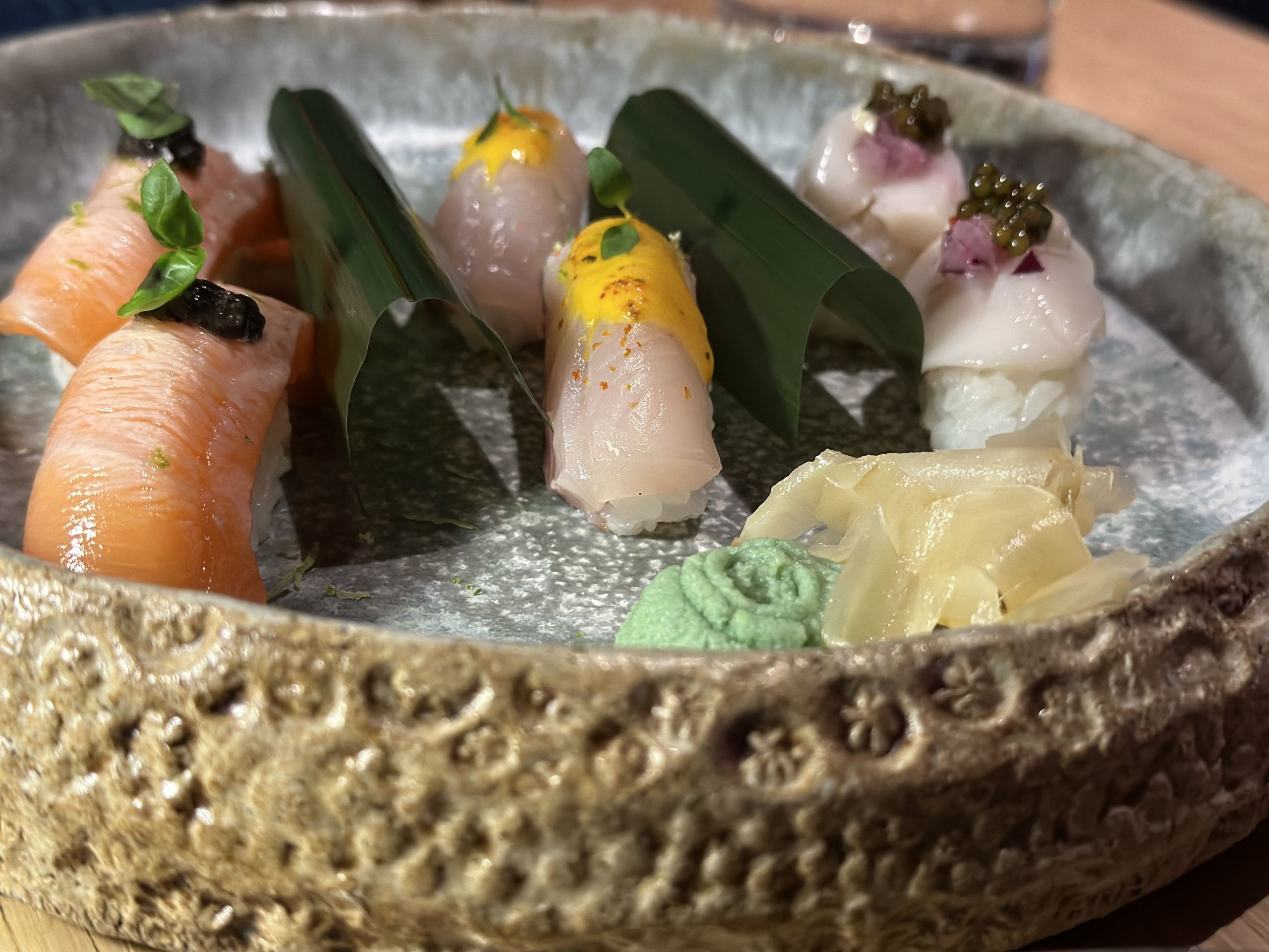 De la fusión peruana y japonesa nos llega una bandeja de niguiris. El primero es el niguiri hamachi (14€ / 2 unidades), con mayonesa de ajo negro, queso parmesano, brotes de albahaca, chalaquita y ralladura de lima. El segundo es el niguiri de salmón flambeado (10€ / 2 unidades), con ralladura de lima, aceite de trufa, sal maldon y shiso. El tercero y tan rico que tuvimos que repetir es el niguiri hotatekai (18€ / 2 unidades), de vieira con caviar imperial y mayonesa de trufa.