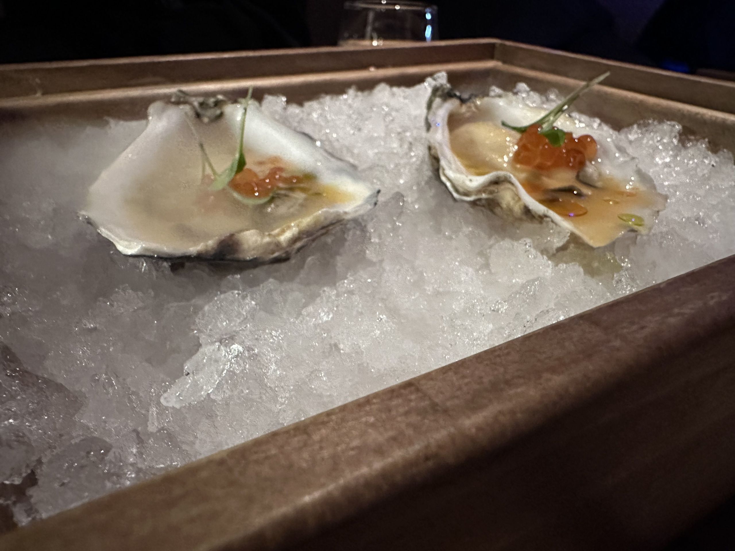 Pero como hay otras cosas, comenzamos disfrutando con una maravillosa ostra kuro (14€), de variedad gillardeau, con leche de tigre de aguaymanto, cocona, aceite de ají limo y cilantro, ikura o huevas de salmón y brotes. Una buena combinación que no debilita ni camufla el intenso sabor a mar del marisco.