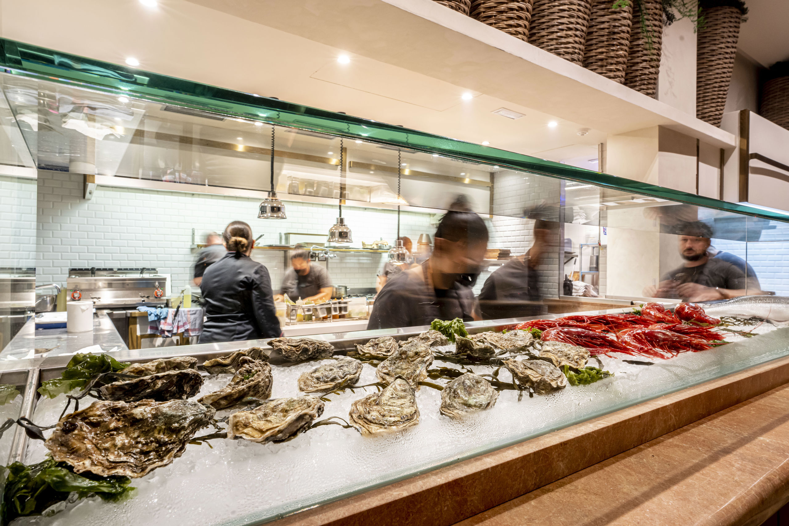 Cocina vista de Mantarraya MX con los mariscos frescos en primer plano.