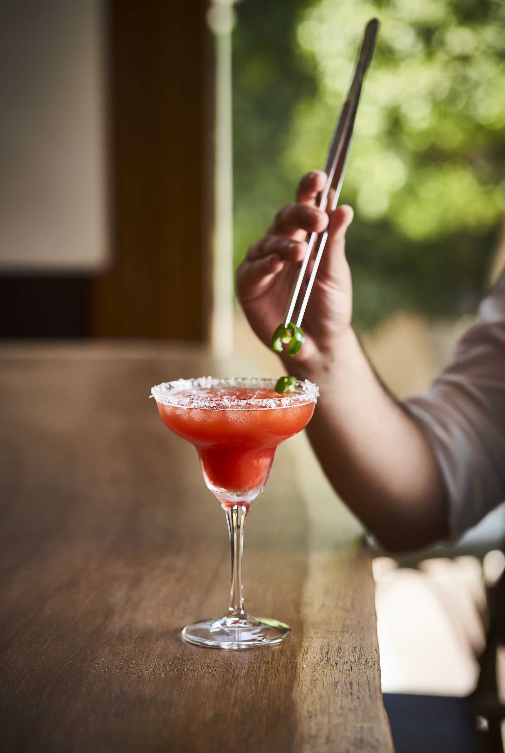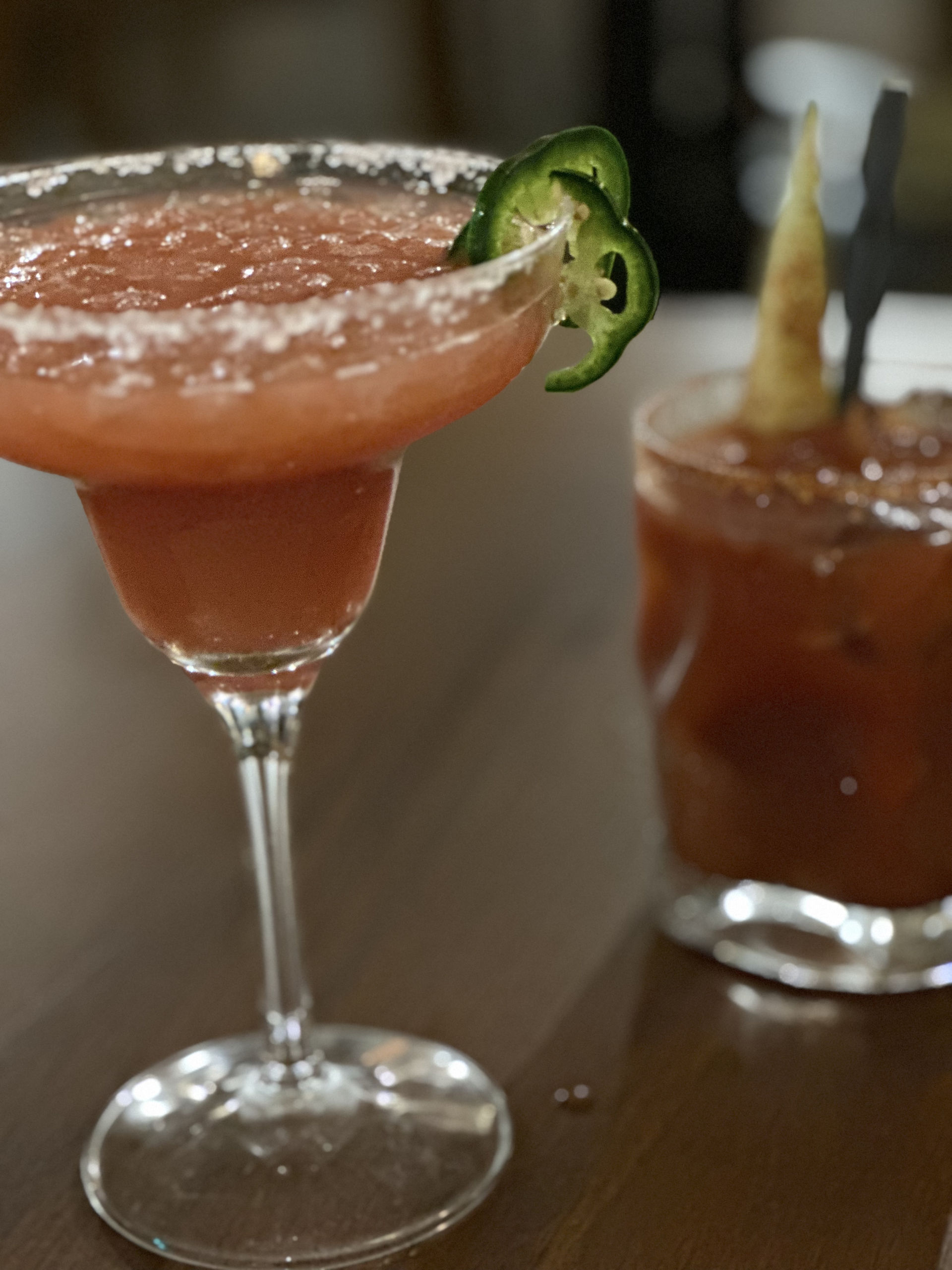 Cócteles Margarita MX, con tequila Don Julio blanco, lima, triple seco, fresa y jalapeño; y el Bloody María, con mezcal Casamigos macerado en apio y jalapeño, nuestro veneno –así lo llaman– zumo de tomate y lima.