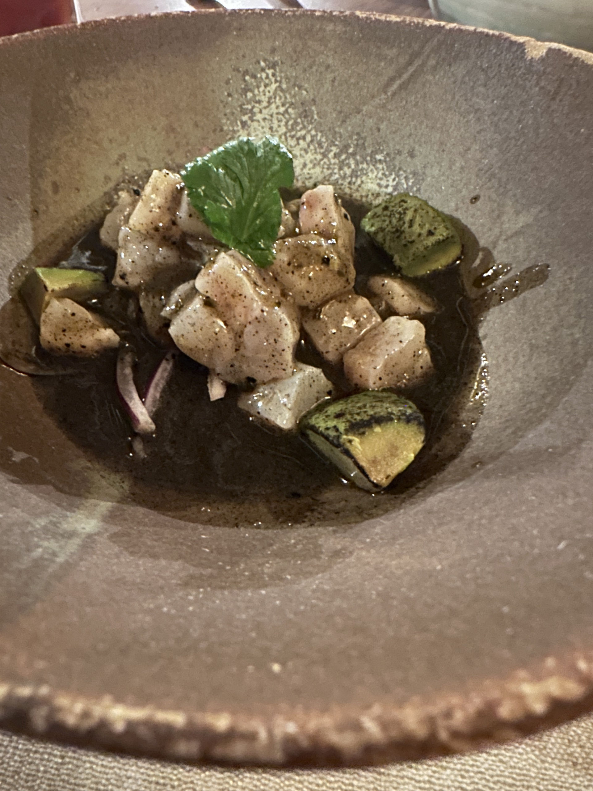 Ceviche negro de lubina, con salsa de chile habanero al carbón.