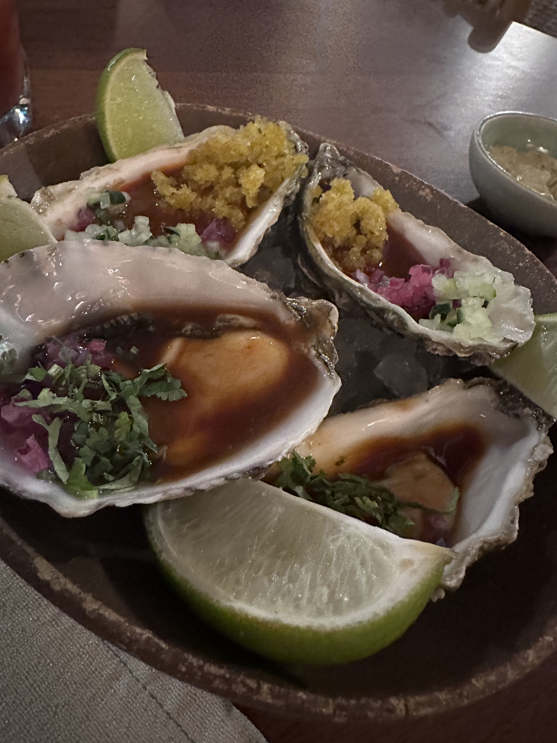 Ostra marisquera, con salsa de chile de árbol o con sabores exóticos como la ostra Sinaloa, con salsa de chiles fermentados y granizado de maracuyá.