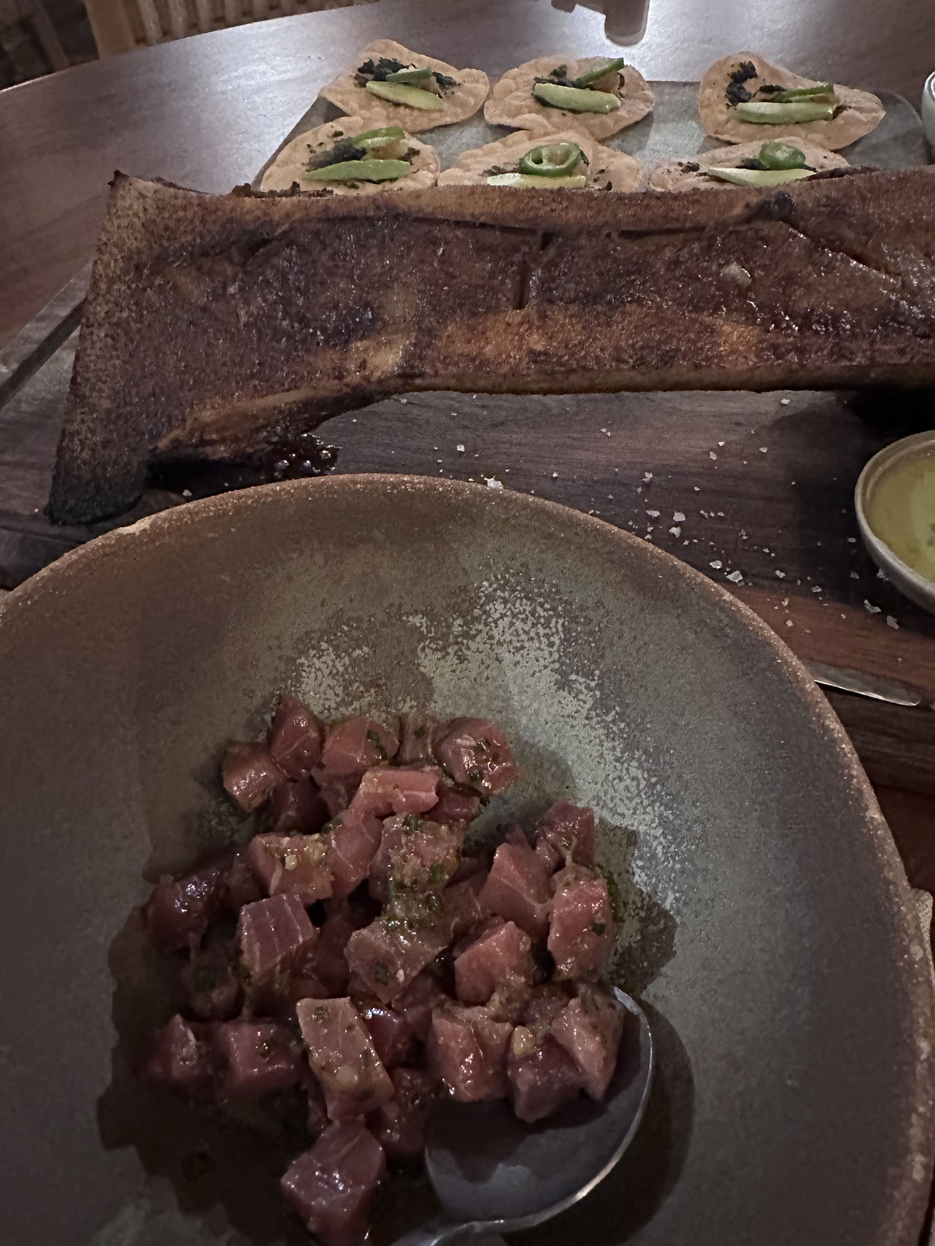 Tuétano a la brasa con tostadas de atún rojo toreado y emulsión de chiles serranos.