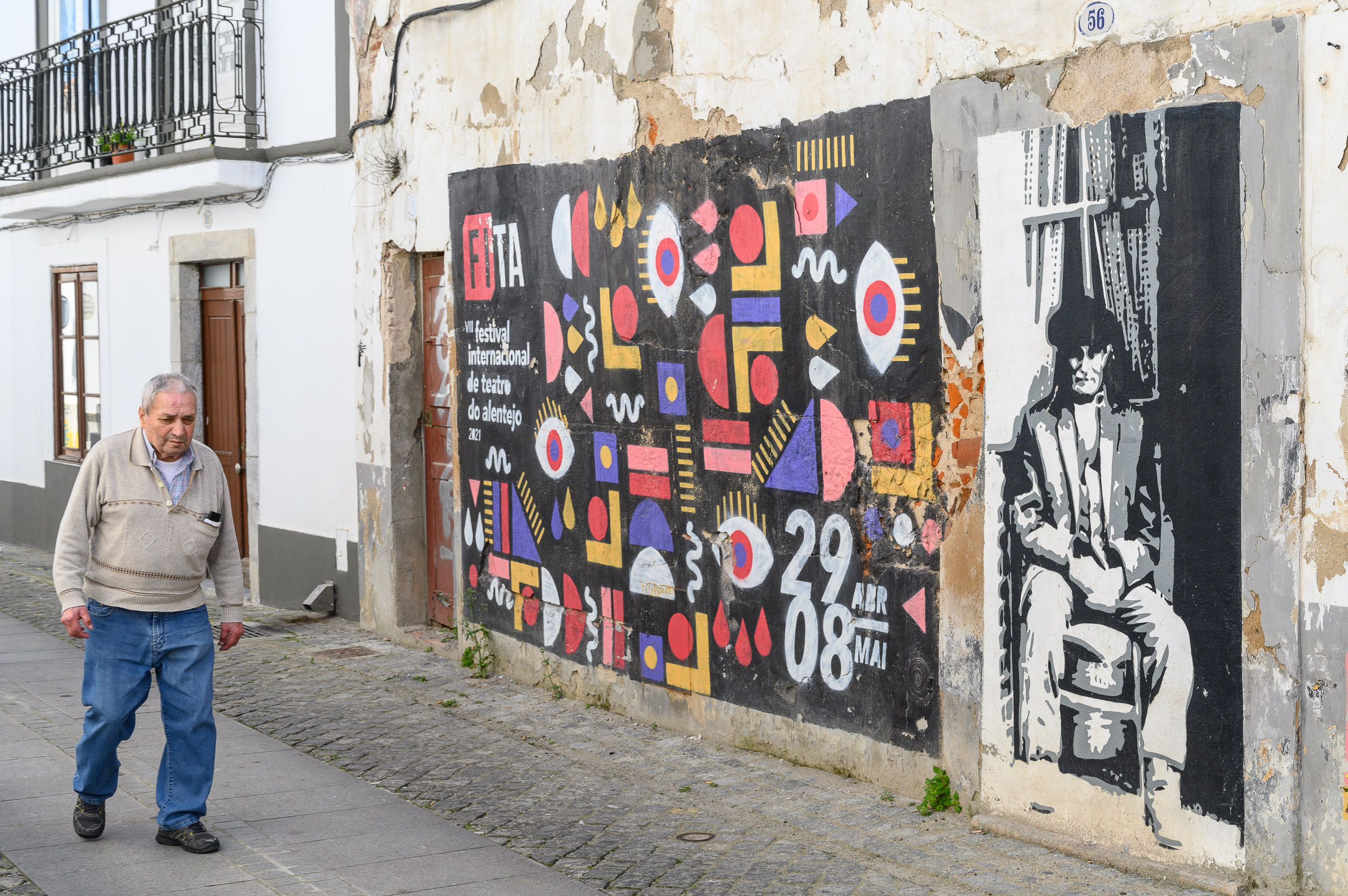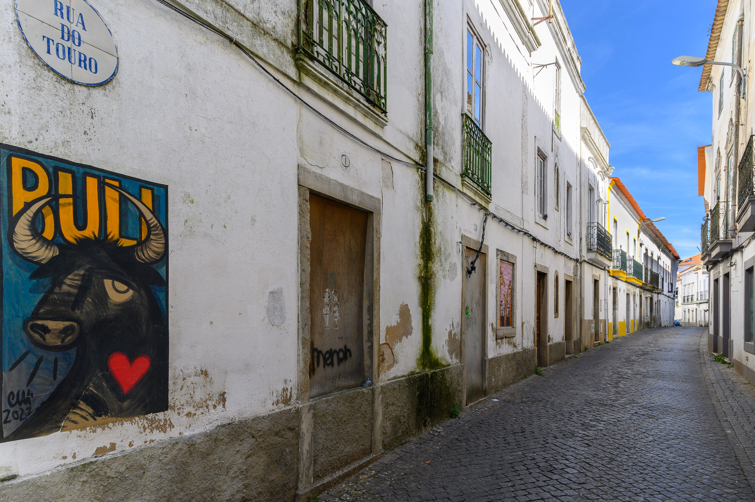 Una de las calles estrechas y llenas de encanto del casco viejo de Beja, con una muestra de arte callejero.