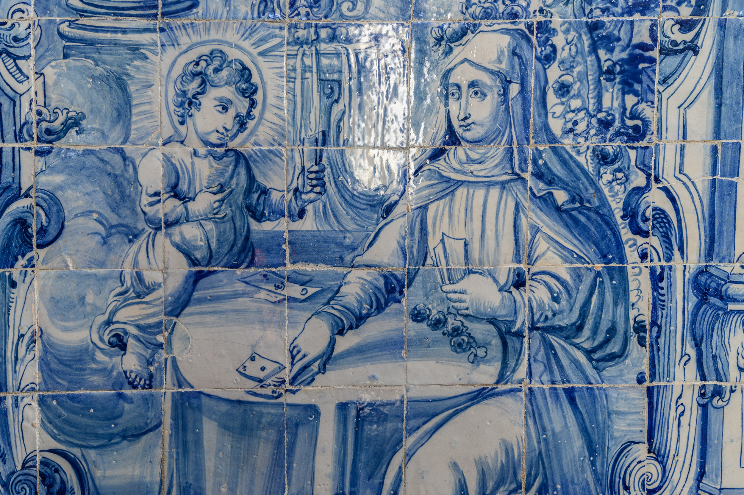 Un llamativo azulejo con el Niño Jesús jugando a las cartas.