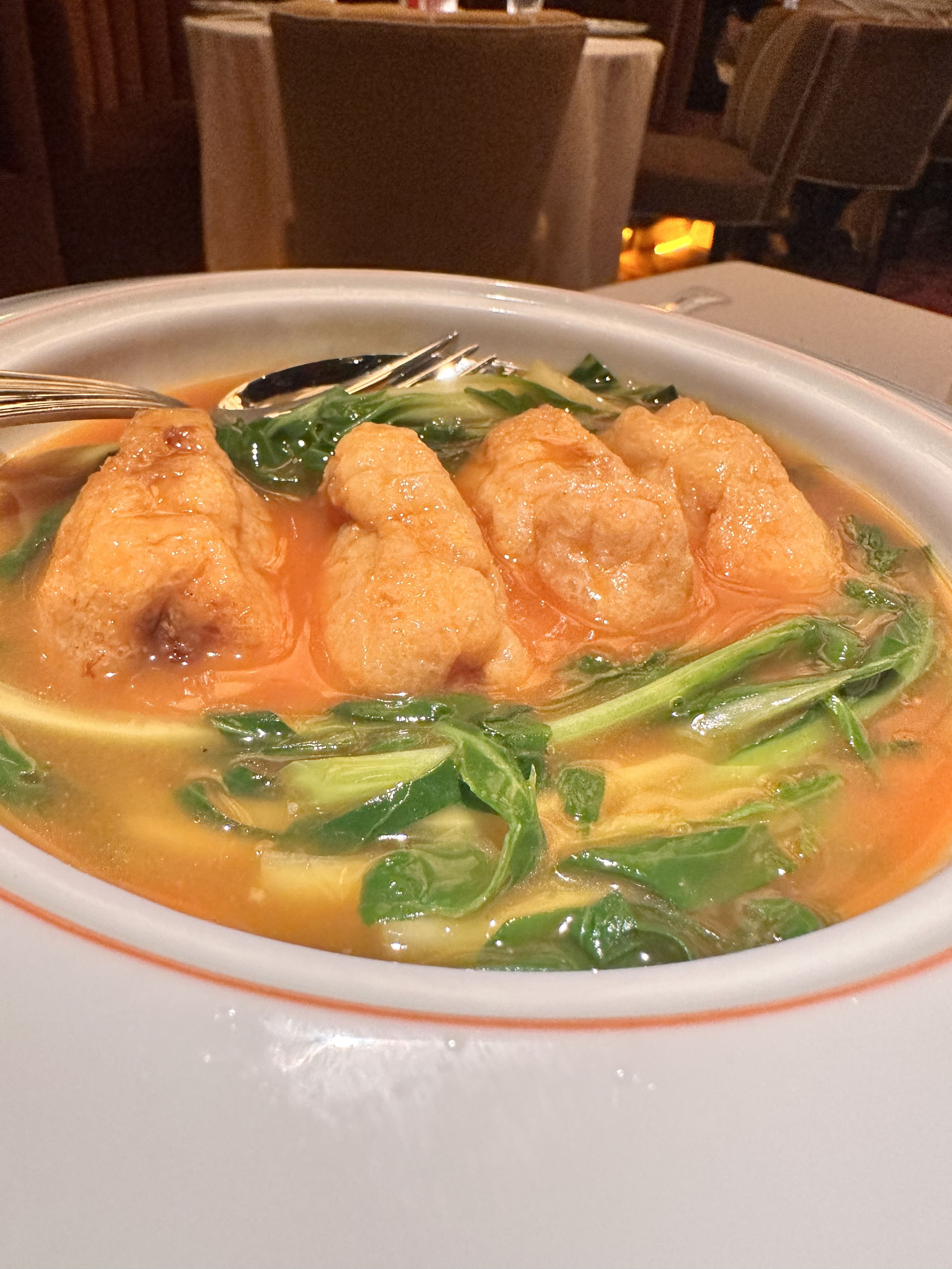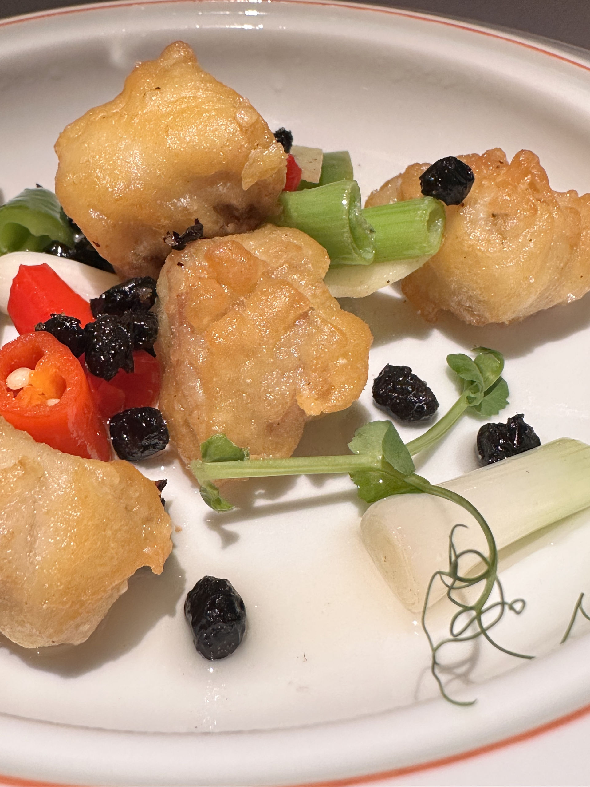 Tofu relleno de ibérico con salsa de abalón, también conocidos como orejas de mar o caracoles marinos, y pak choi.