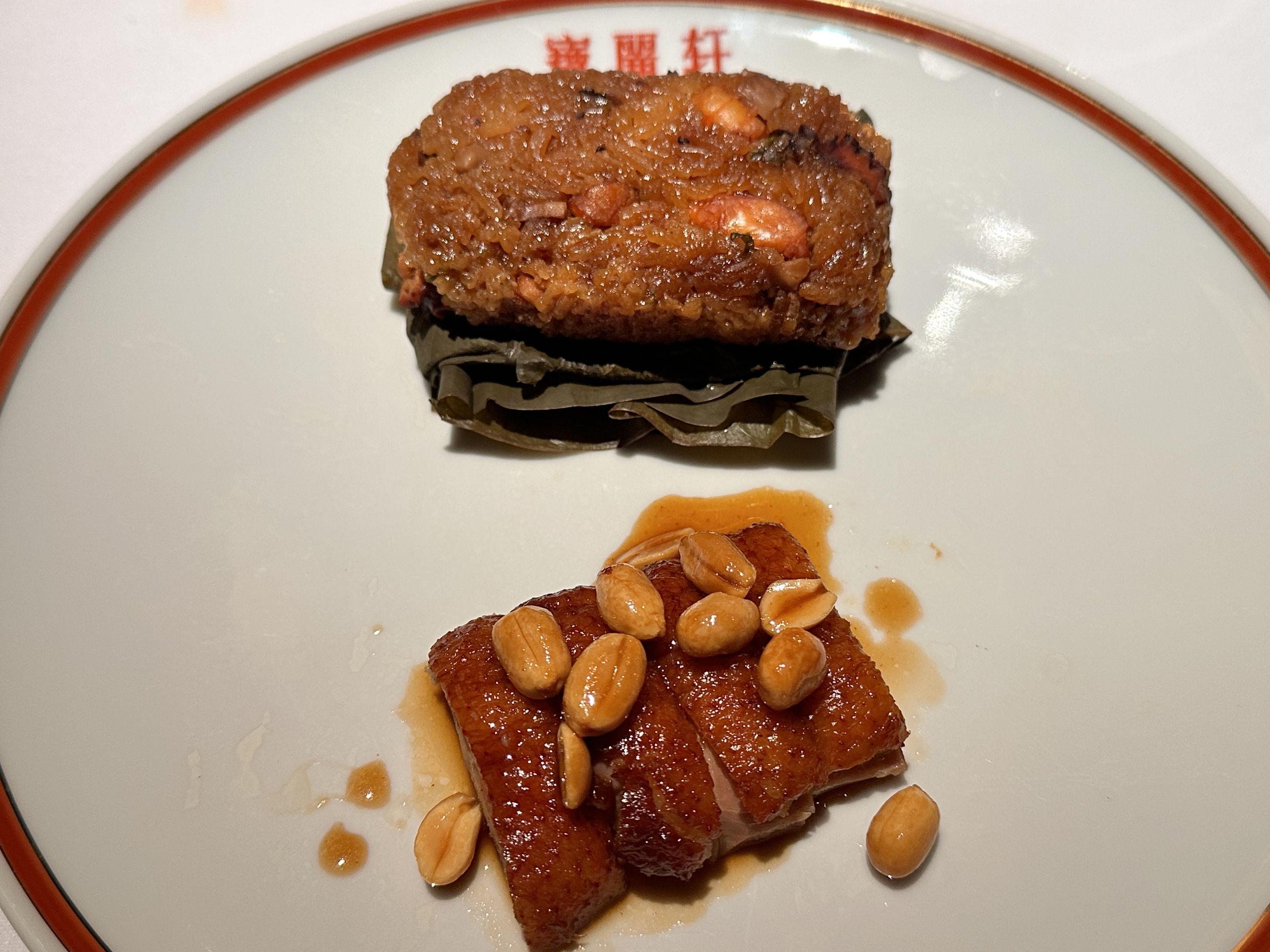 El plato fuerte llega con el arroz "golden lotus" envuelto en hoja de loto con marisco que sirve de acompañamiento al maravilloso pato asado estilo cantonés.