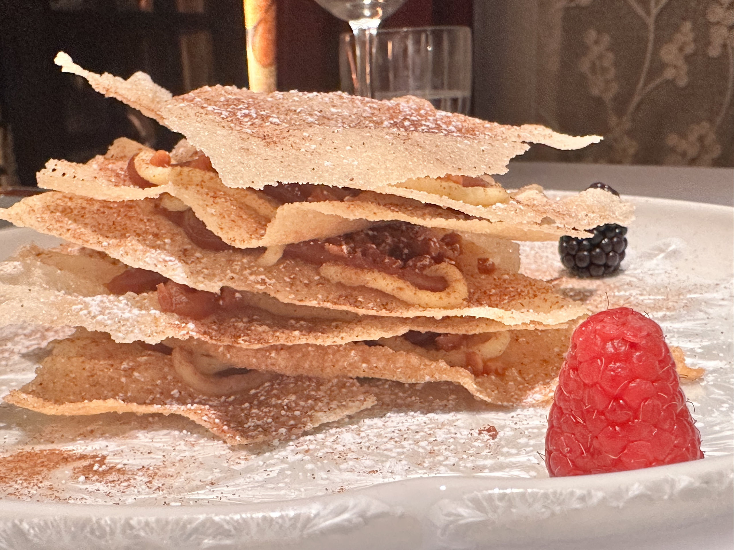 Espectacular tarta milhojas de jengibre con merengue y frutos del bosque que recuerda a la tarta árabe pero superándola.