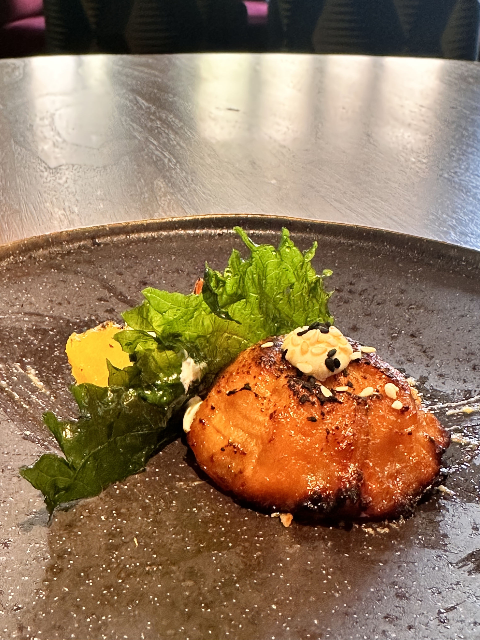 Maravillosas las black cod balls, a modo de buñuelos de bacalao negro marinado en miso y albaricoque confitado, un plato de 10.