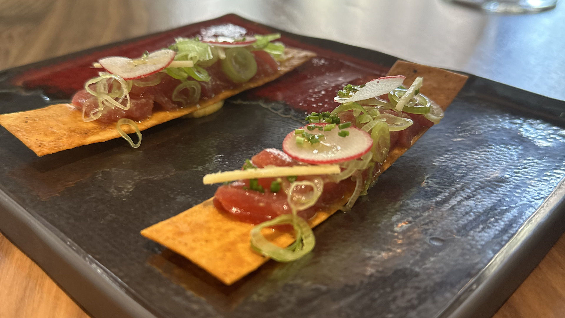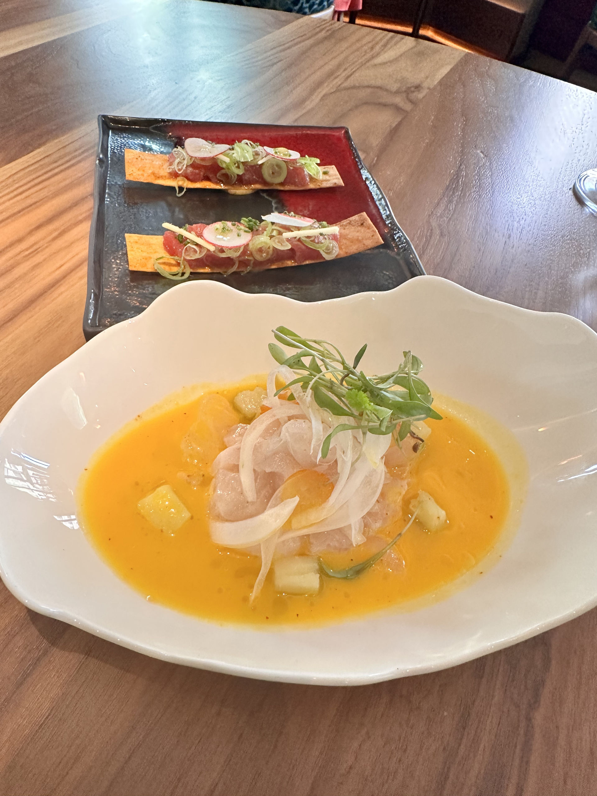 Ceviche de pescado blanco, con leche de tigre de mandarina, yuca y cilantro y pizzitas de sashimi de atún del Mediterráneo con vinagreta de wasabi.