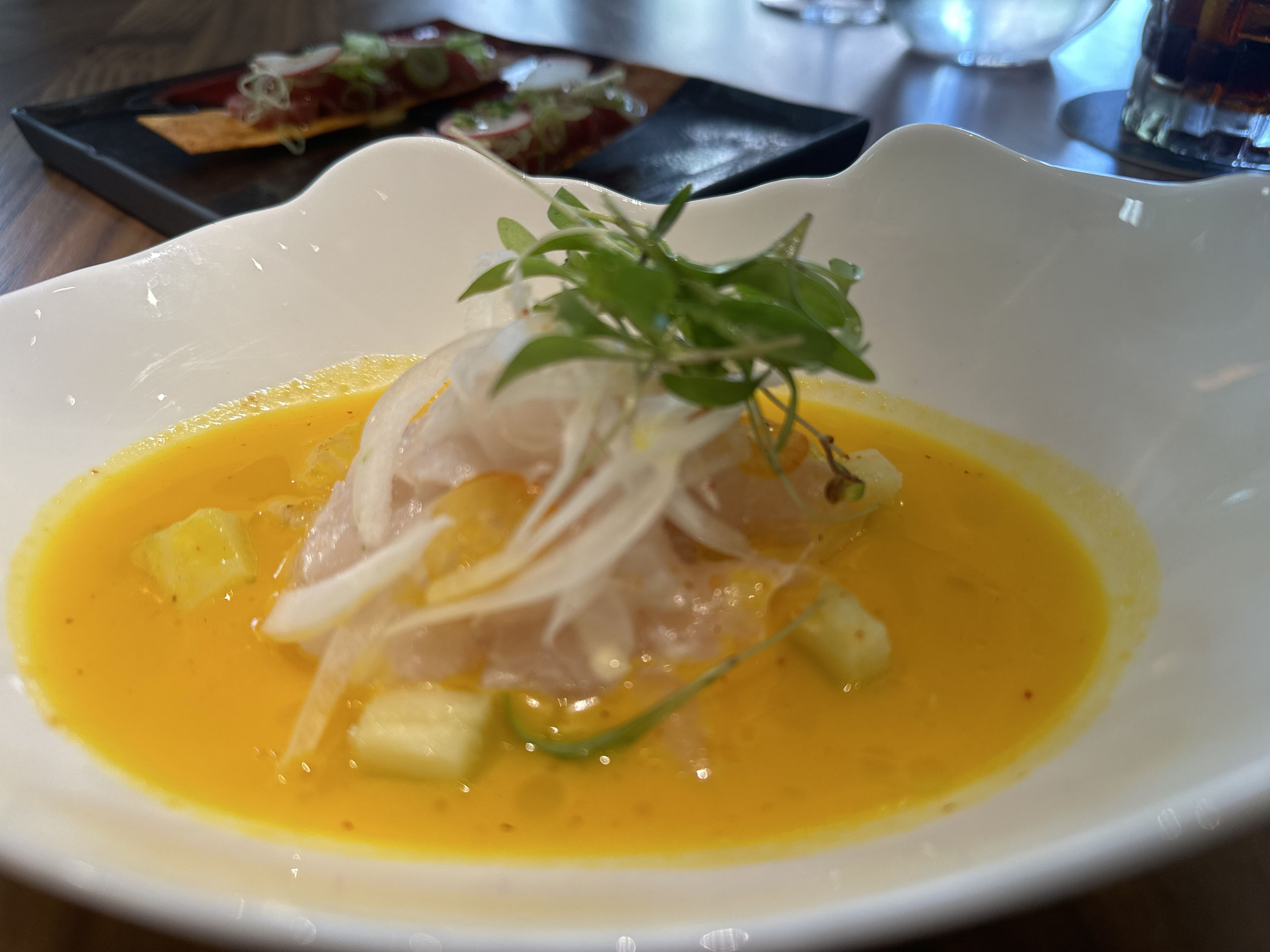 Muy bueno también el ceviche de pescado blanco, con leche de tigre de mandarina, yuca y cilantro.