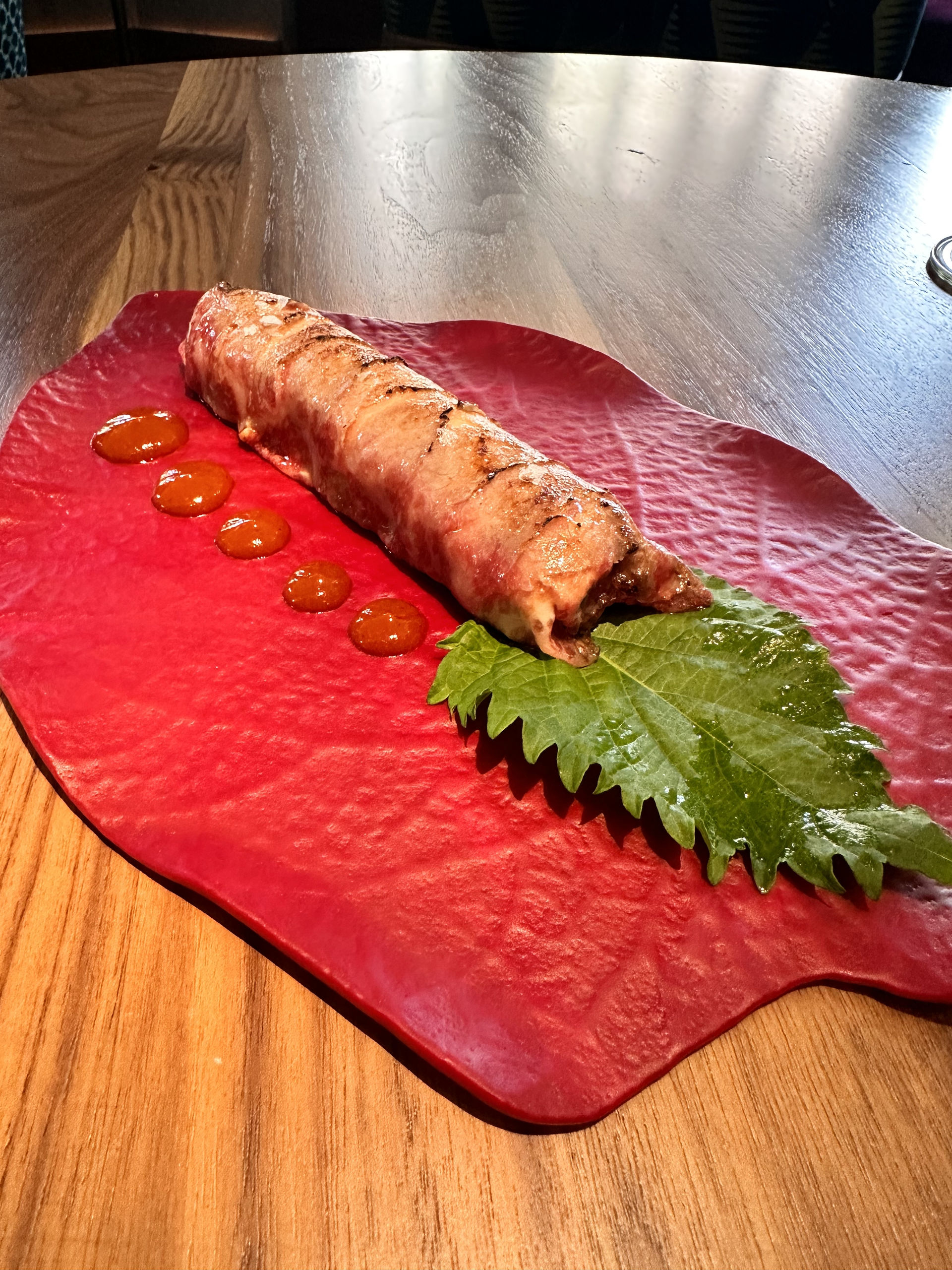 Ensaladilla japonesa de Wagyu A-5 sopleteado, origen Kagoshima, con patata, arroz de sushi frito, salsa anticuchera y coronado por la carne flambeada que lo envuelve como un gran niguiri.