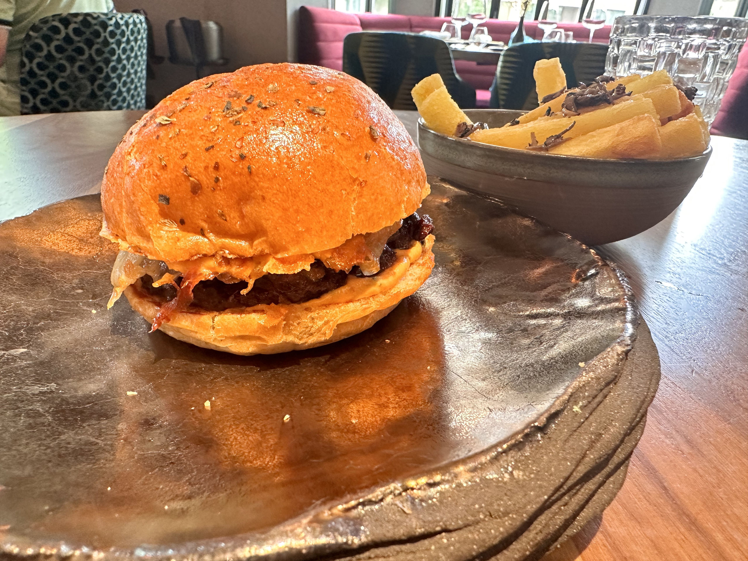 Media burger de Wagyu con velo ibérico, queso ahumado y salsa Abya.