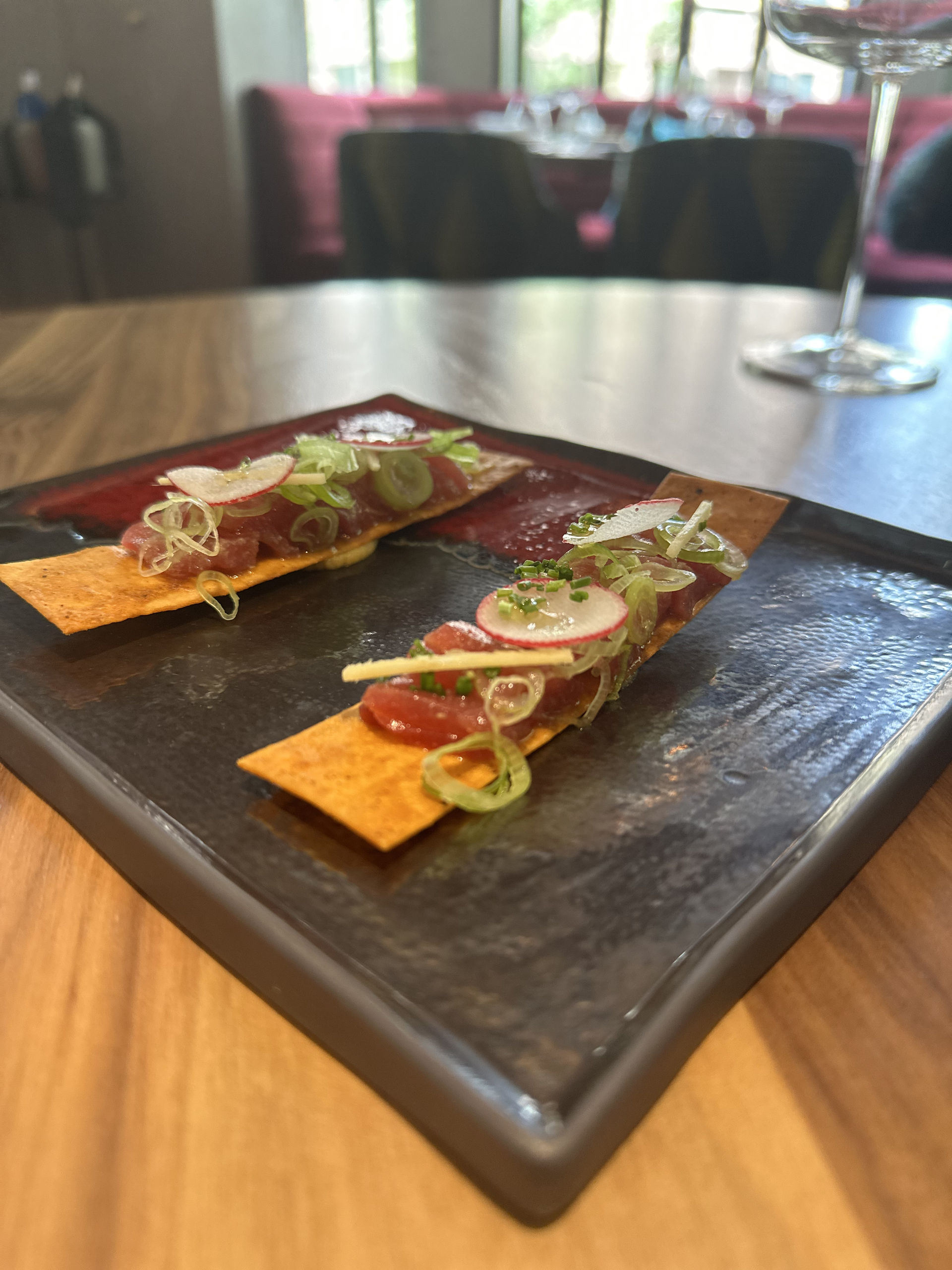 Maravilloso bocado de pizzitas de sashimi de atún del Mediterráneo con una estupenda vinagreta de wasabi.