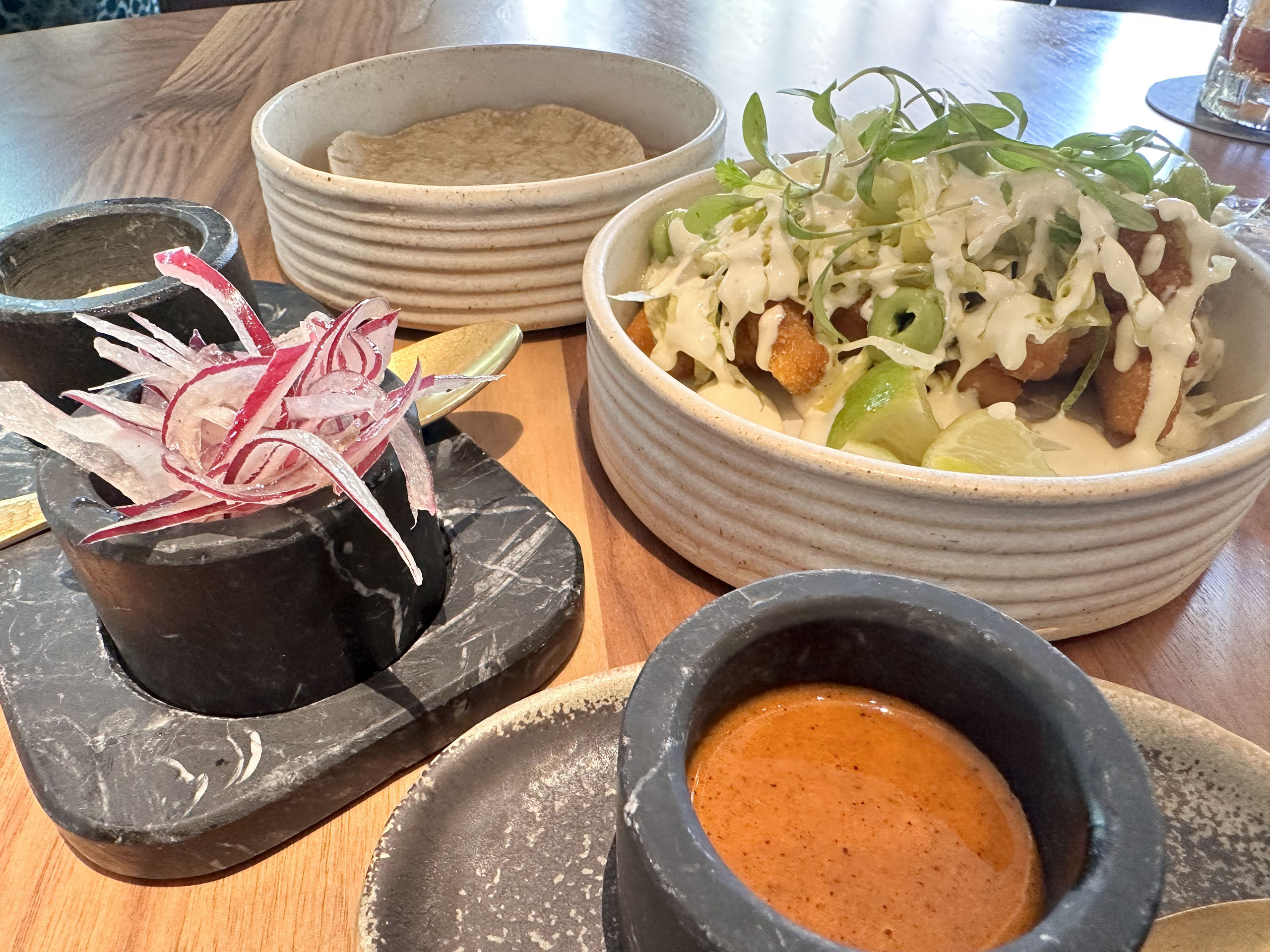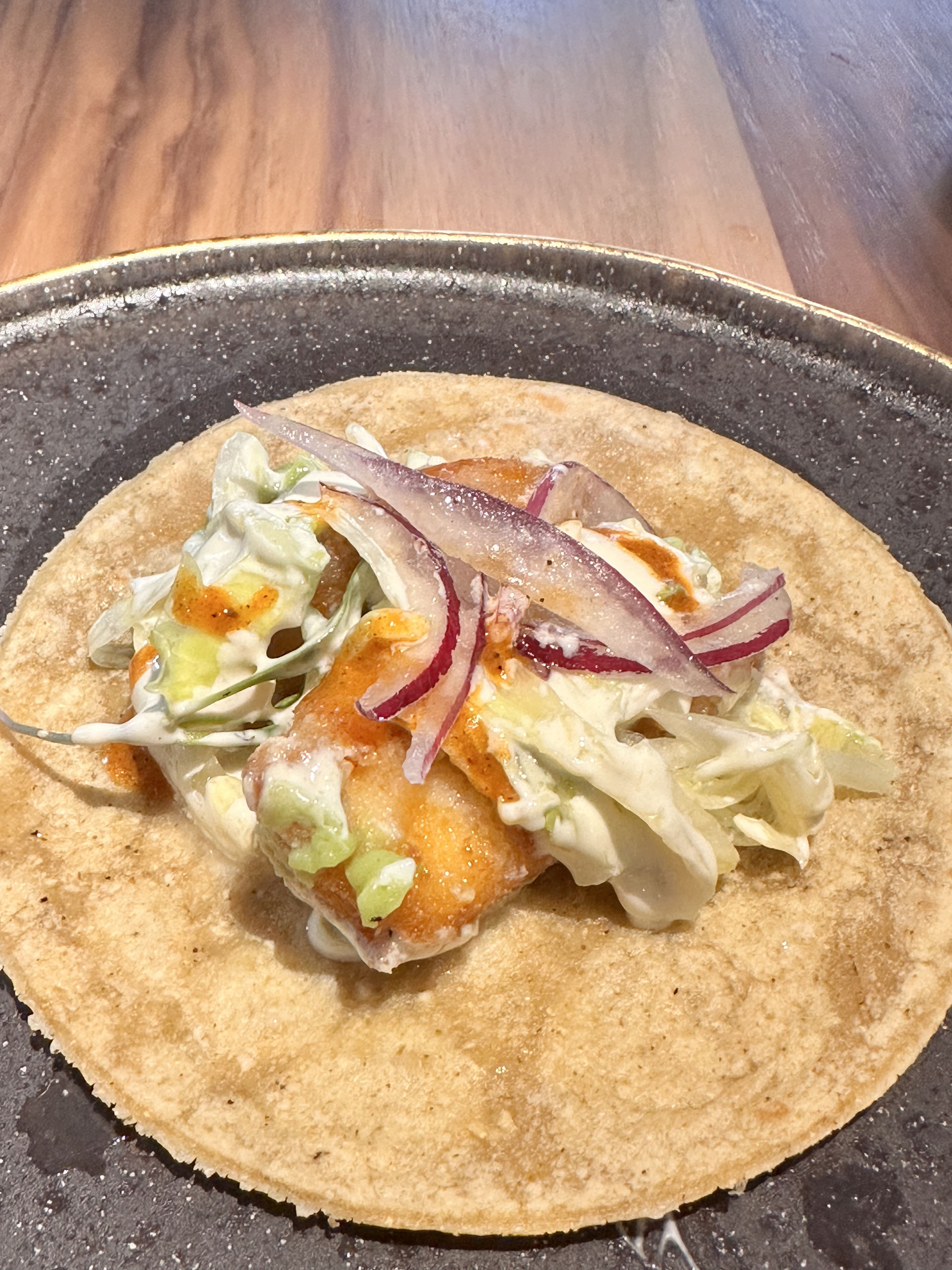 Taco de lenguado adobado a la andaluza, con crema de chile piquín y aguacate encurtido.
