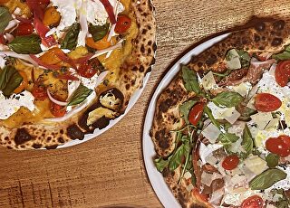Entre los ingredientes de esta pizza encontramos el espárrago, mozzarella "fior di latte" artesanal, queso Galmesan gallego y papada de cerdo 100% ibérico de bellota.