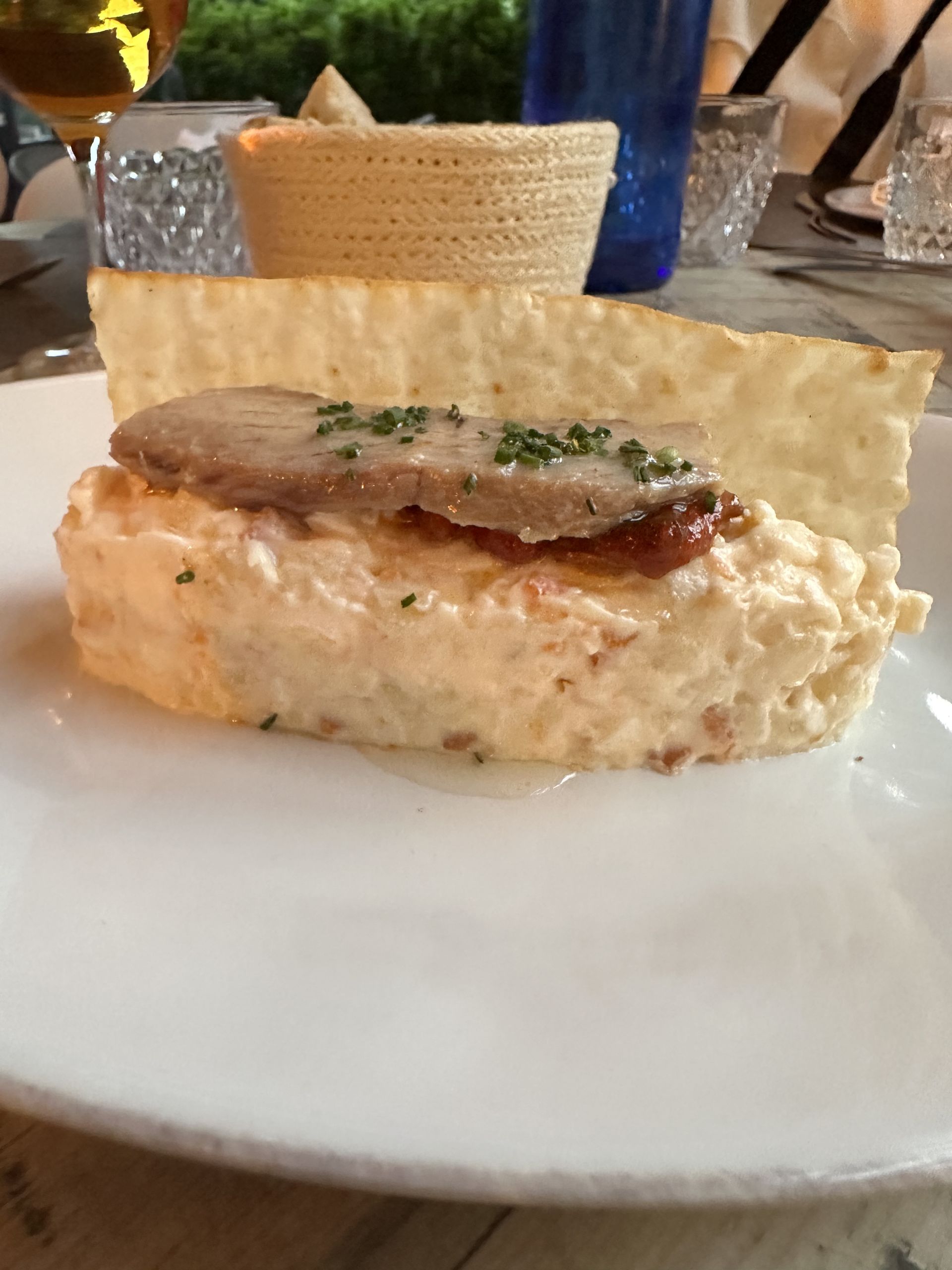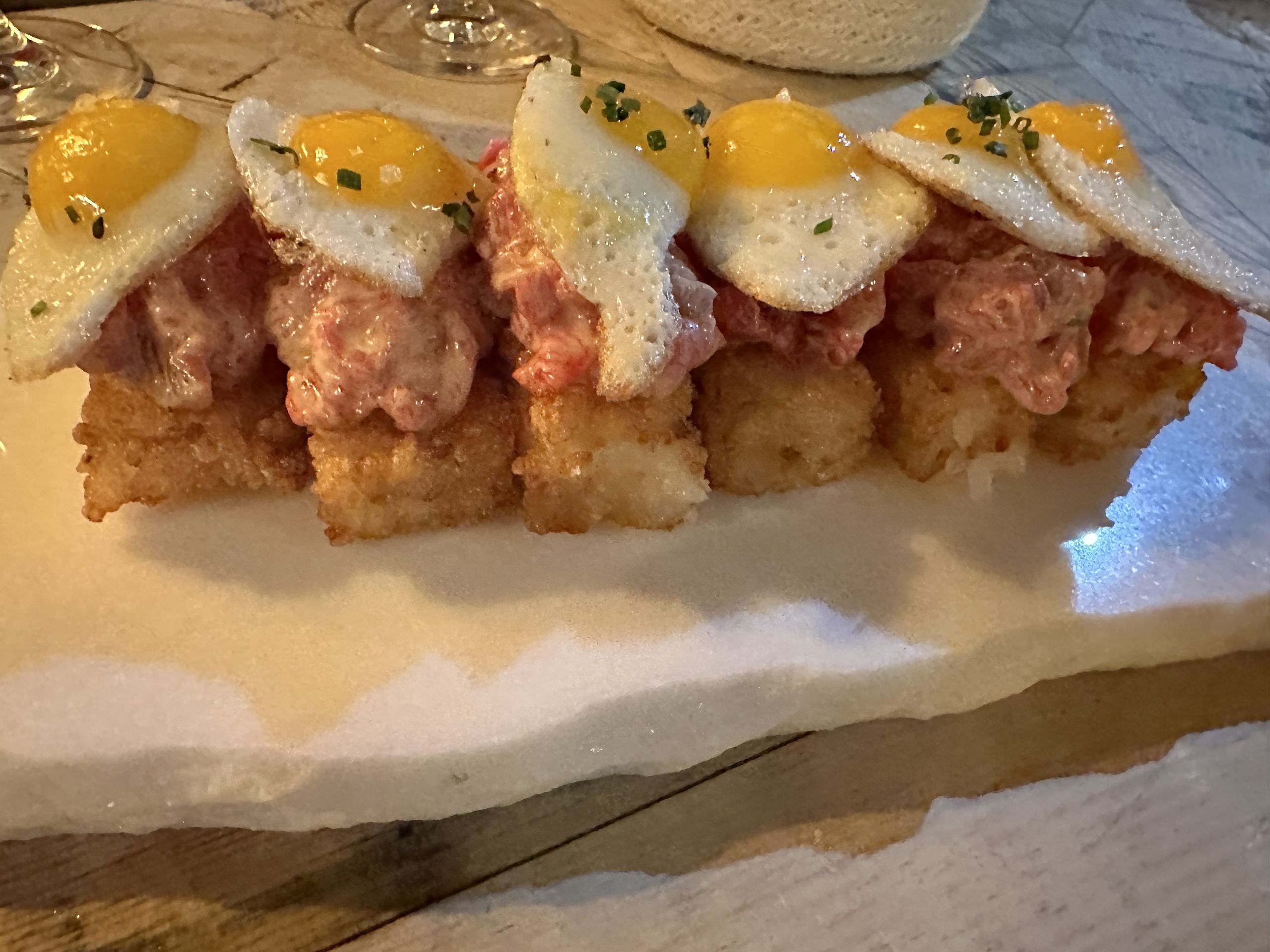 Espectacular niguiri frito de steak tartar con huevo de codorniz, para comerlo con las manos de un bocado.