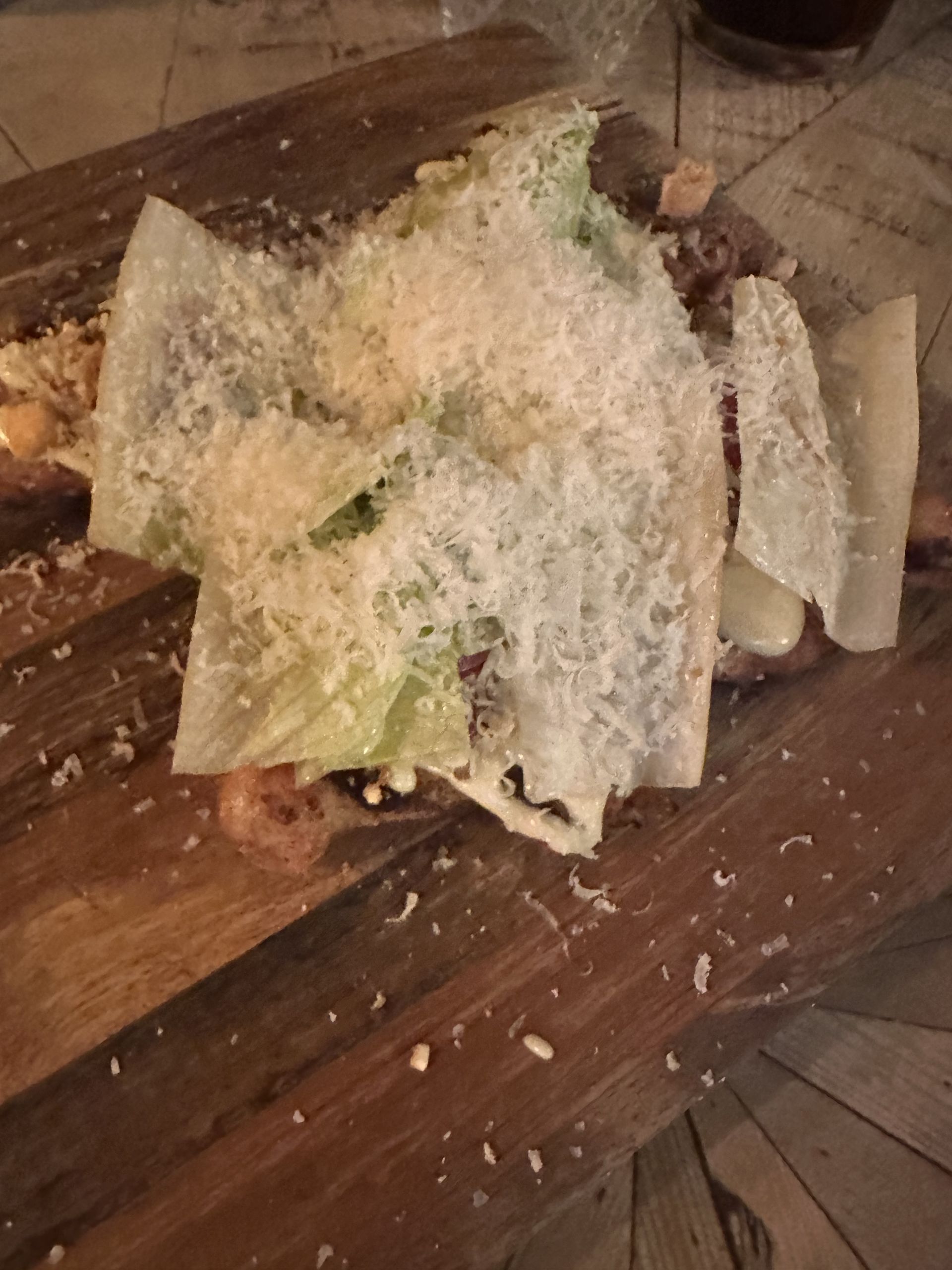 Aquí el pollo finísimo César terminado con la lechuga y parmesano rallado.
