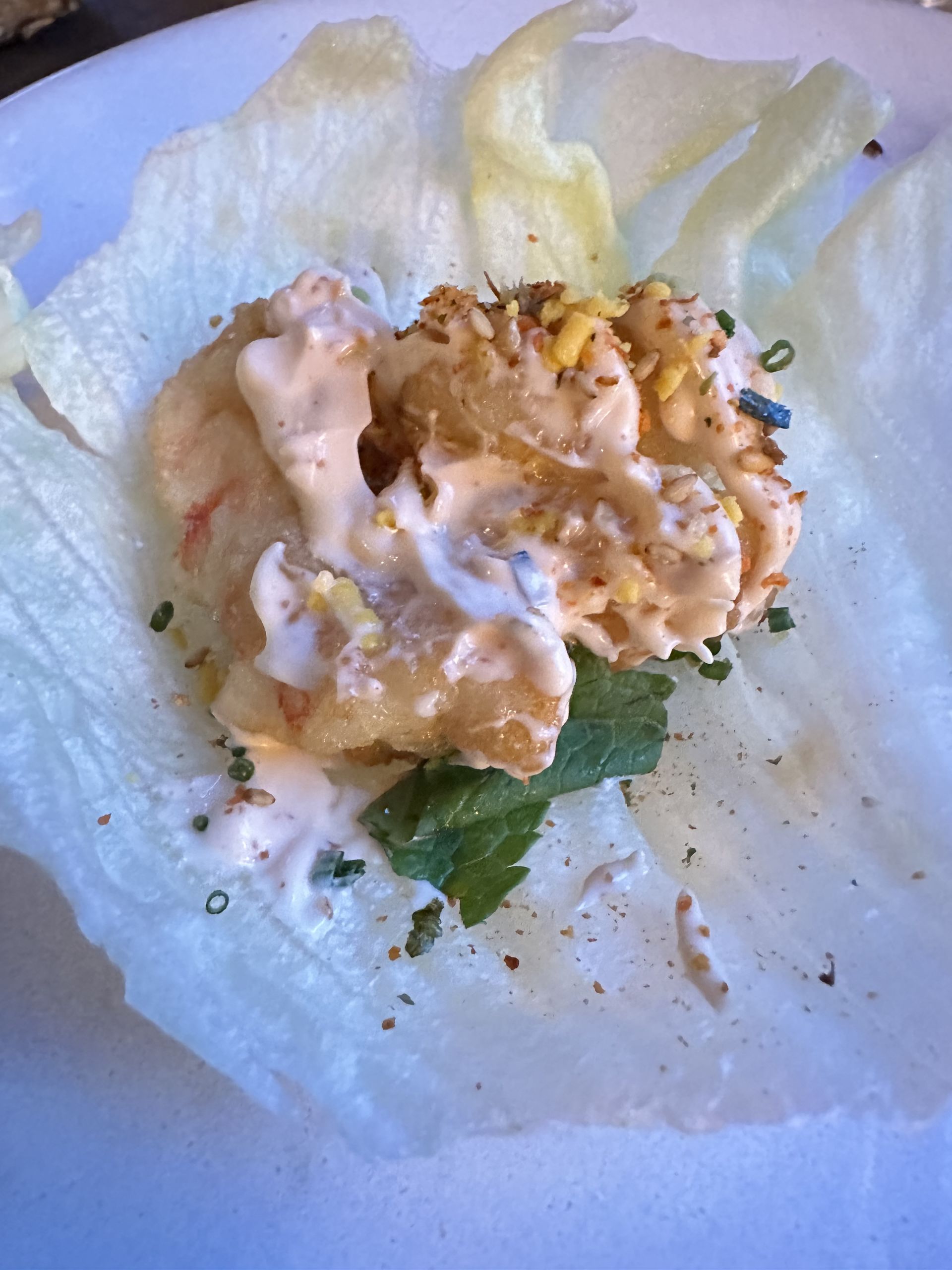 El saam de colitas de gamba en tempura japonesa servidos sobre una hoja de lechuga y coronados con mayonesa de chipotle que le aporta un ligero toque picante.