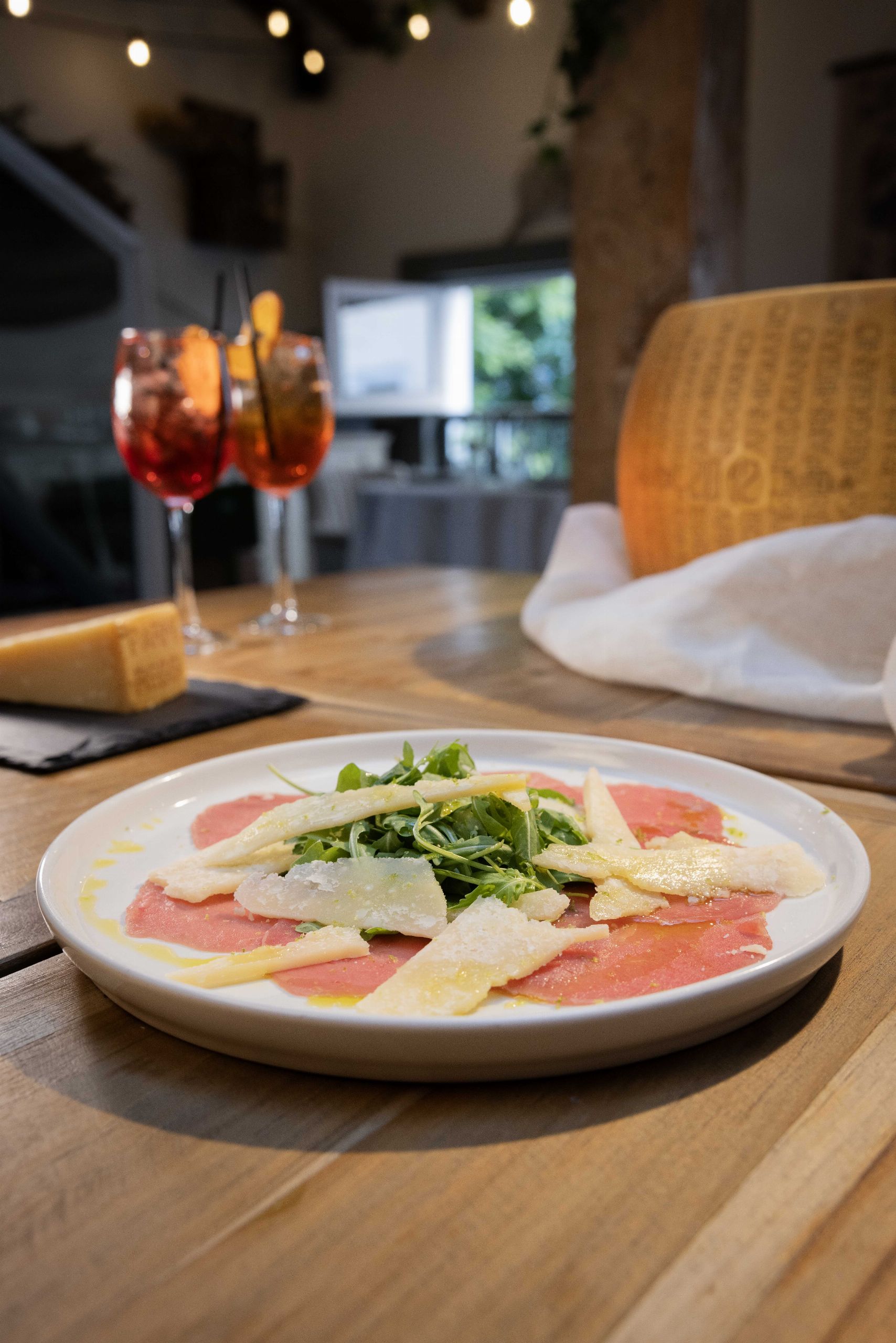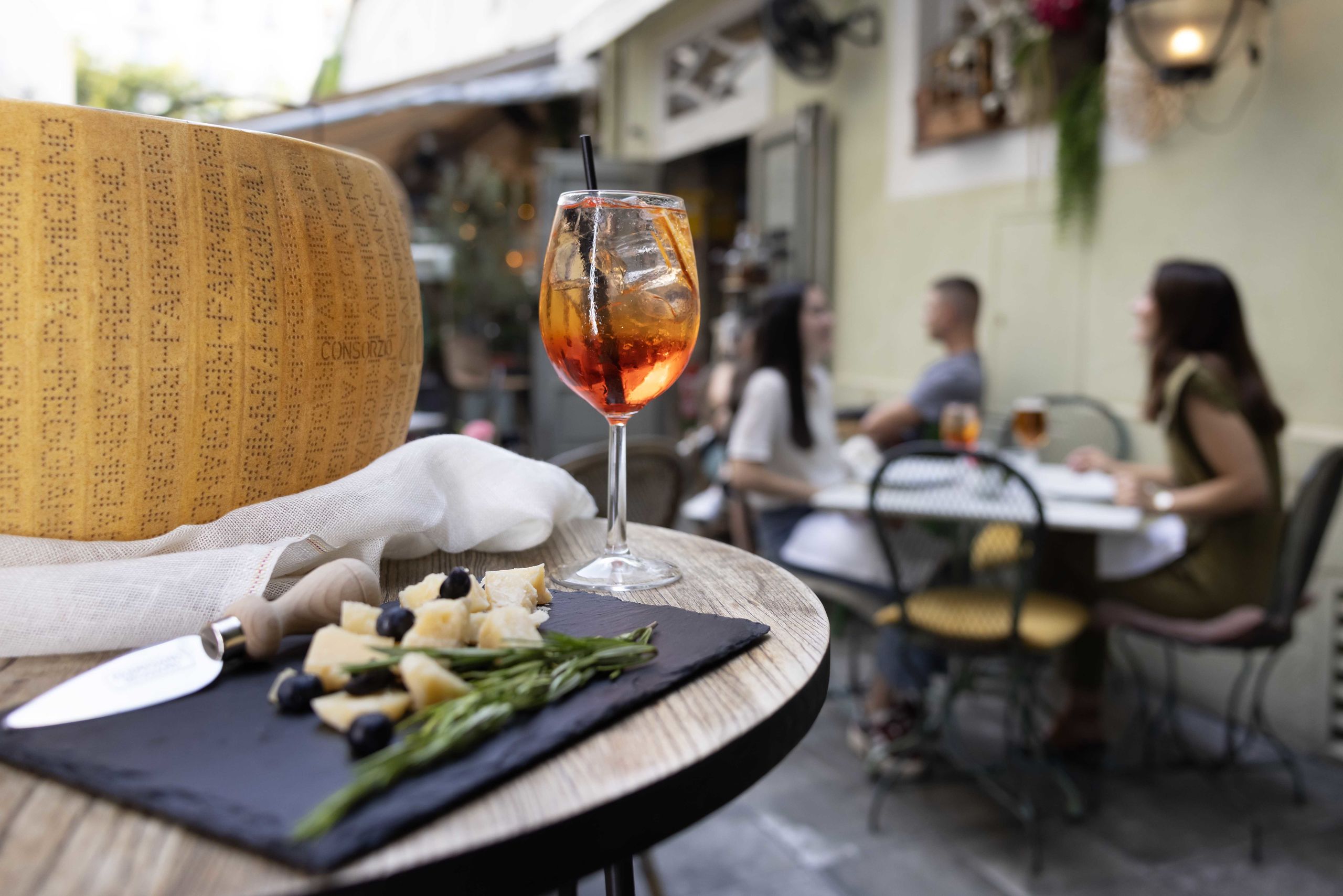 La tradicional rueda de Parmigiano Reggiano con las lascas de queso listas para comer y un Vermout Spritz para acompañarlo.