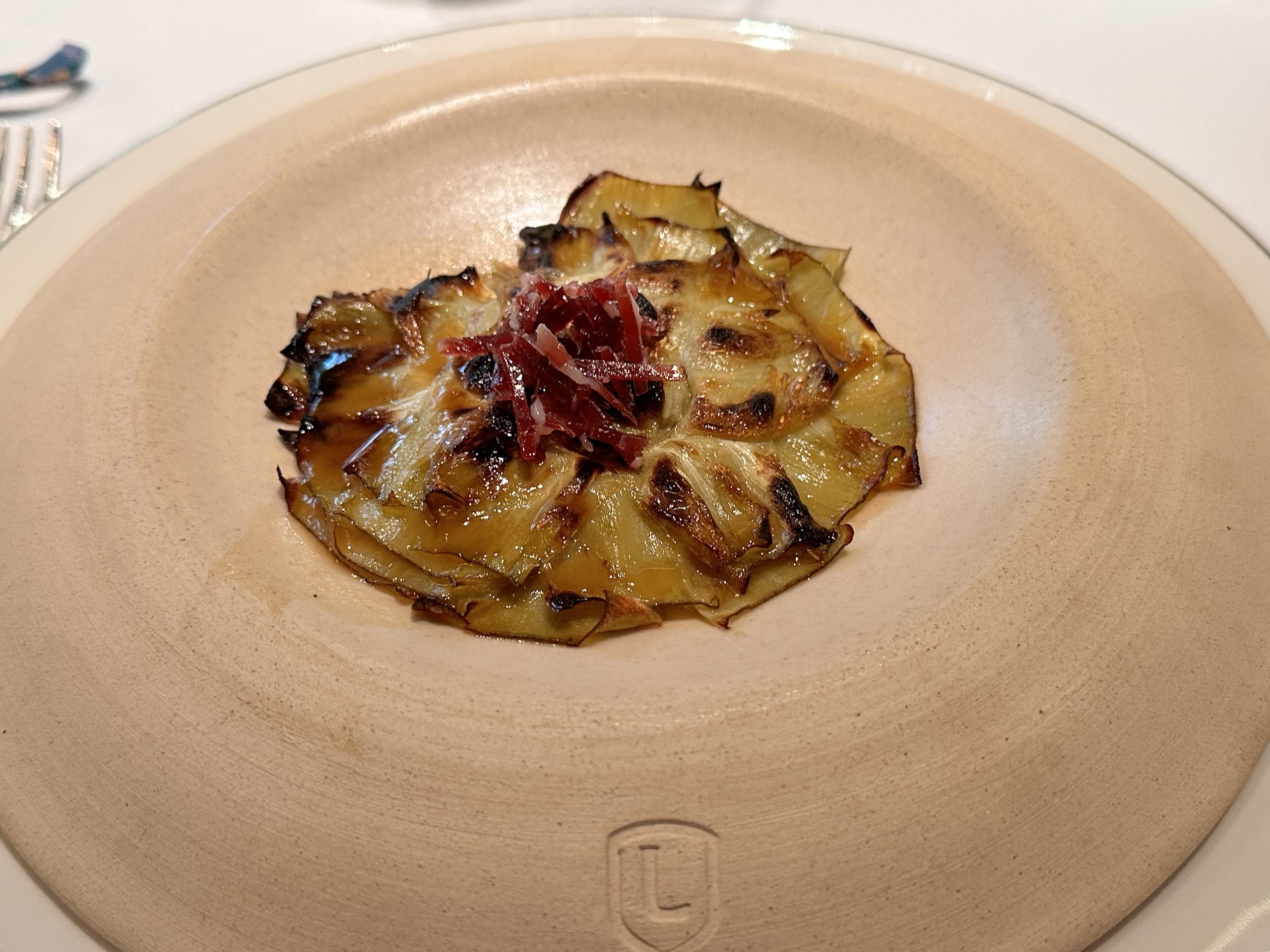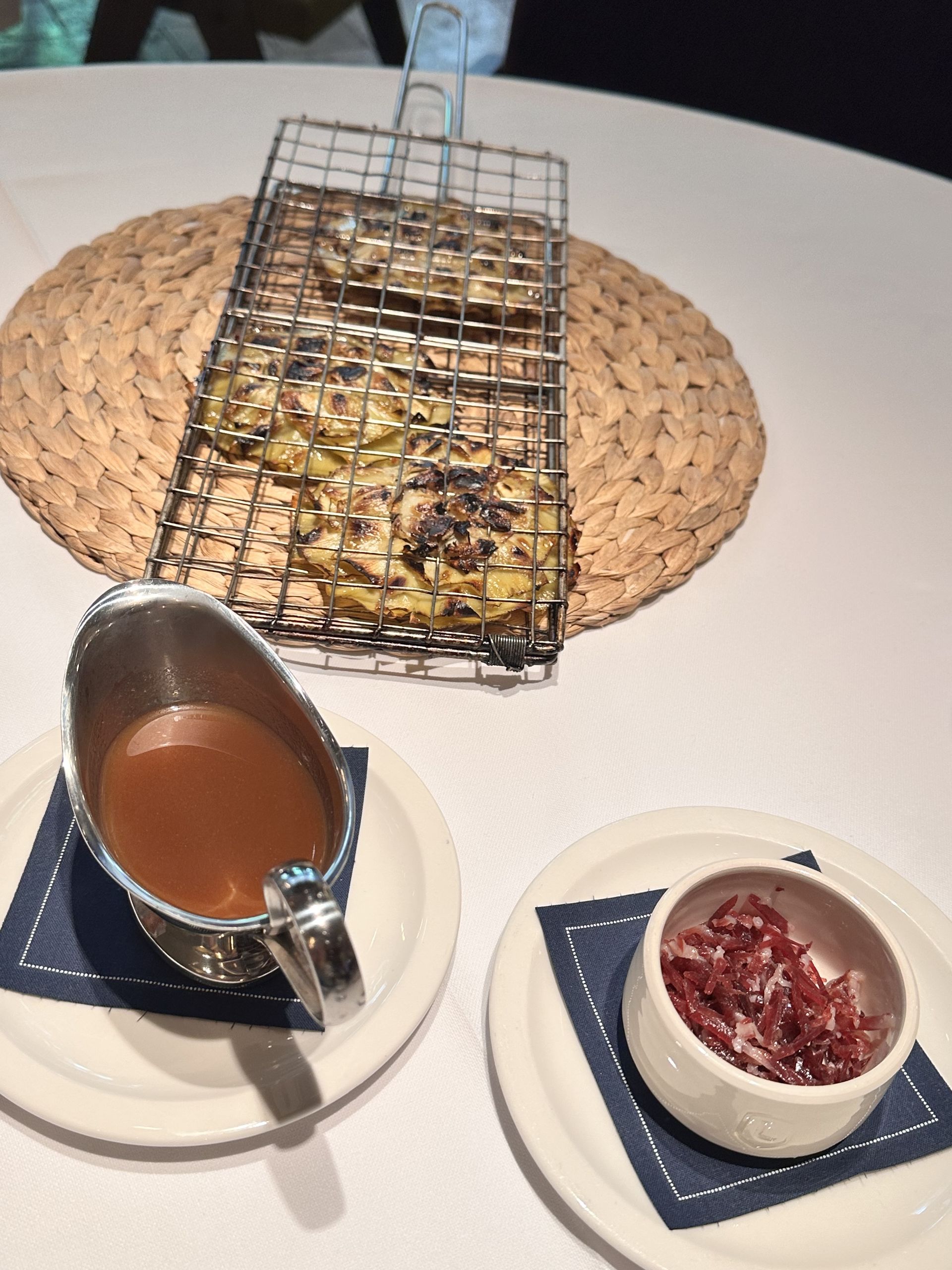 Alcachofas de Tudela en kokotxera, preparadas a la brasa que le aporta un toque crujiente maravilloso y coronadas con un brutal consomé de jamón ibérico y lascas de jamón.