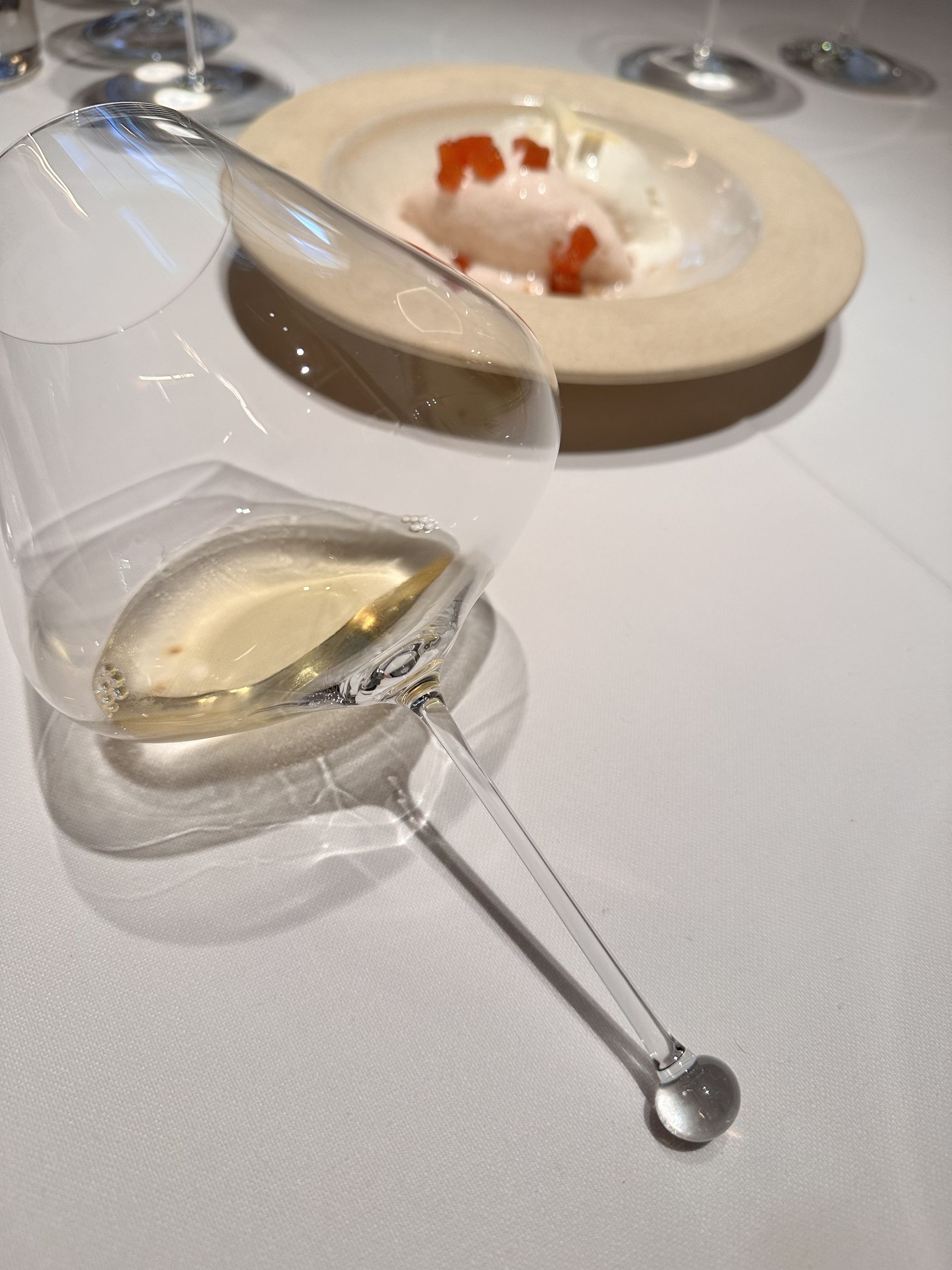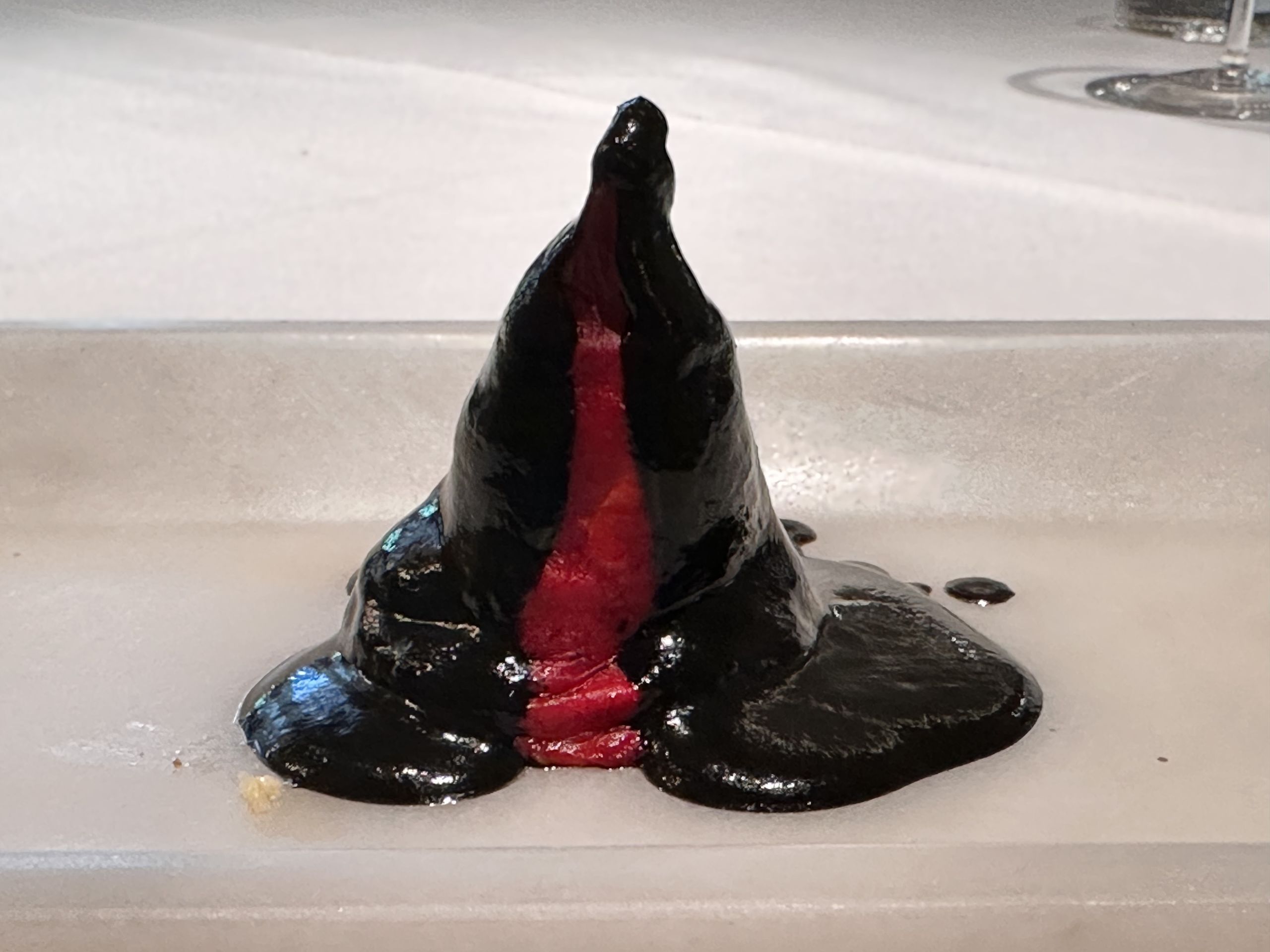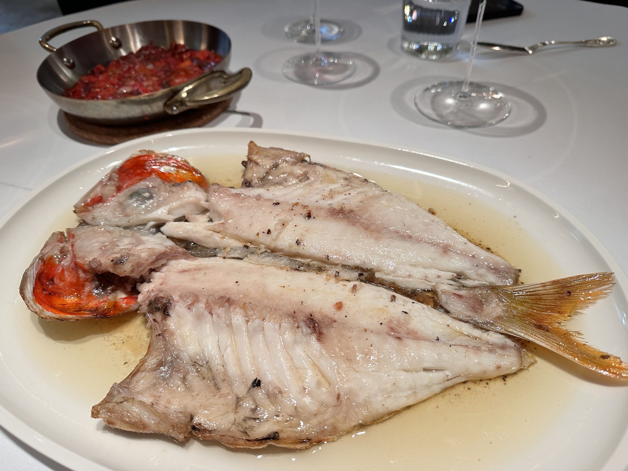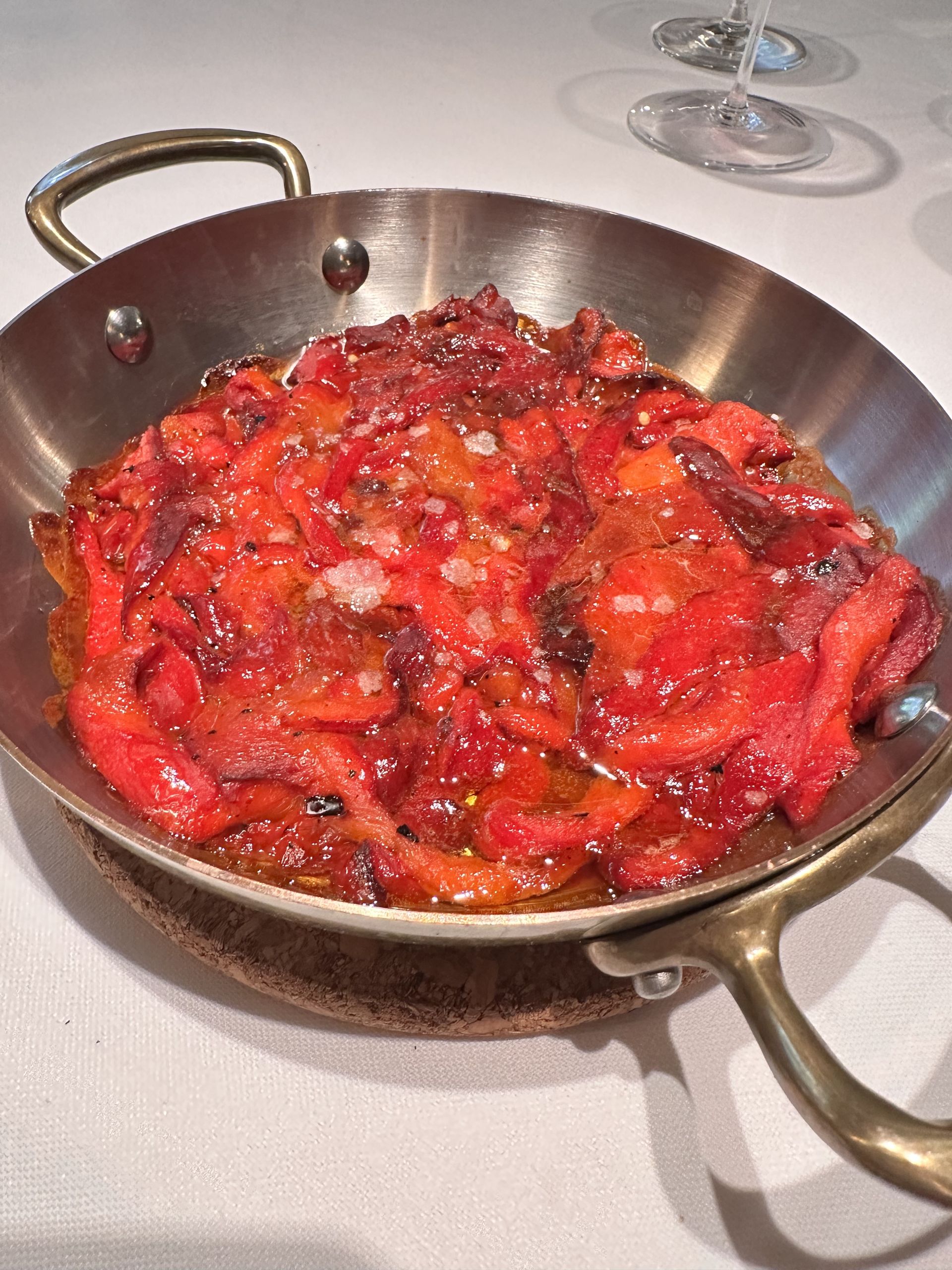 El besugo del Cantábrico es descomunal. Con una emulsión de su propio jugo y un toque de vinagre de manzana, aceite y sal que acompaña de una forma extraordinaria. Como los increíbles pimientos de Calahorra, también asados a la brasa y con un sabor que no se olvida.