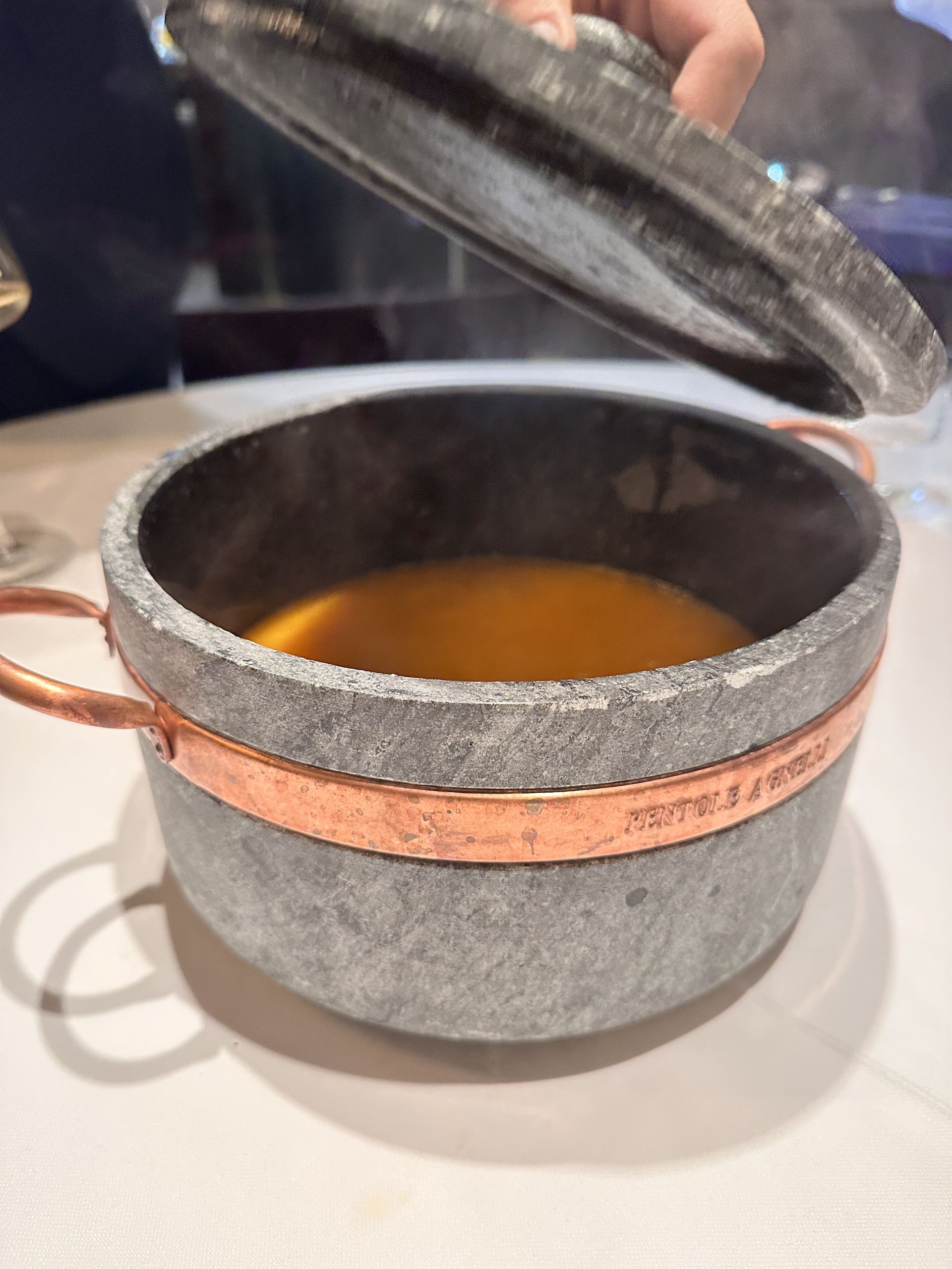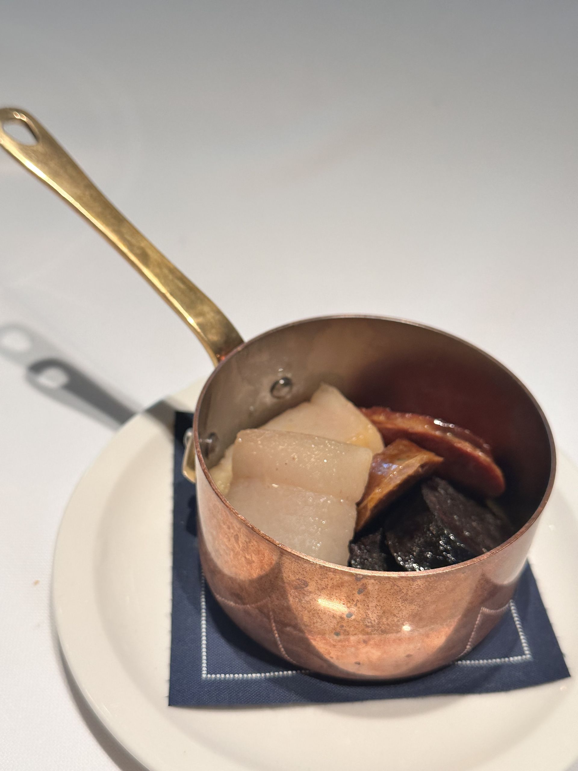 La kokotxera en las que se preparan las alcachofas a la brasa, el brutal consomé de jamón ibérico y las lascas de jamón.