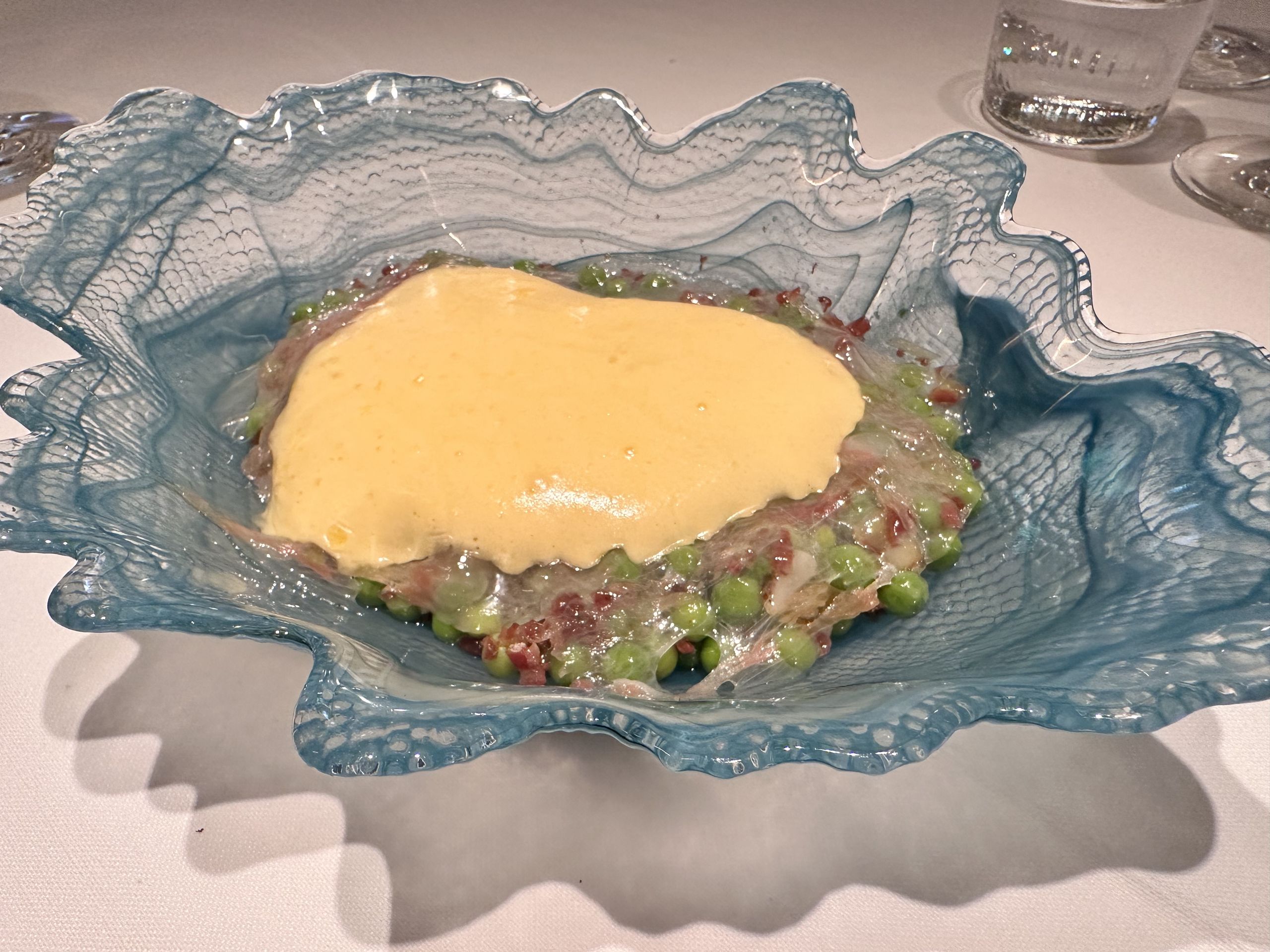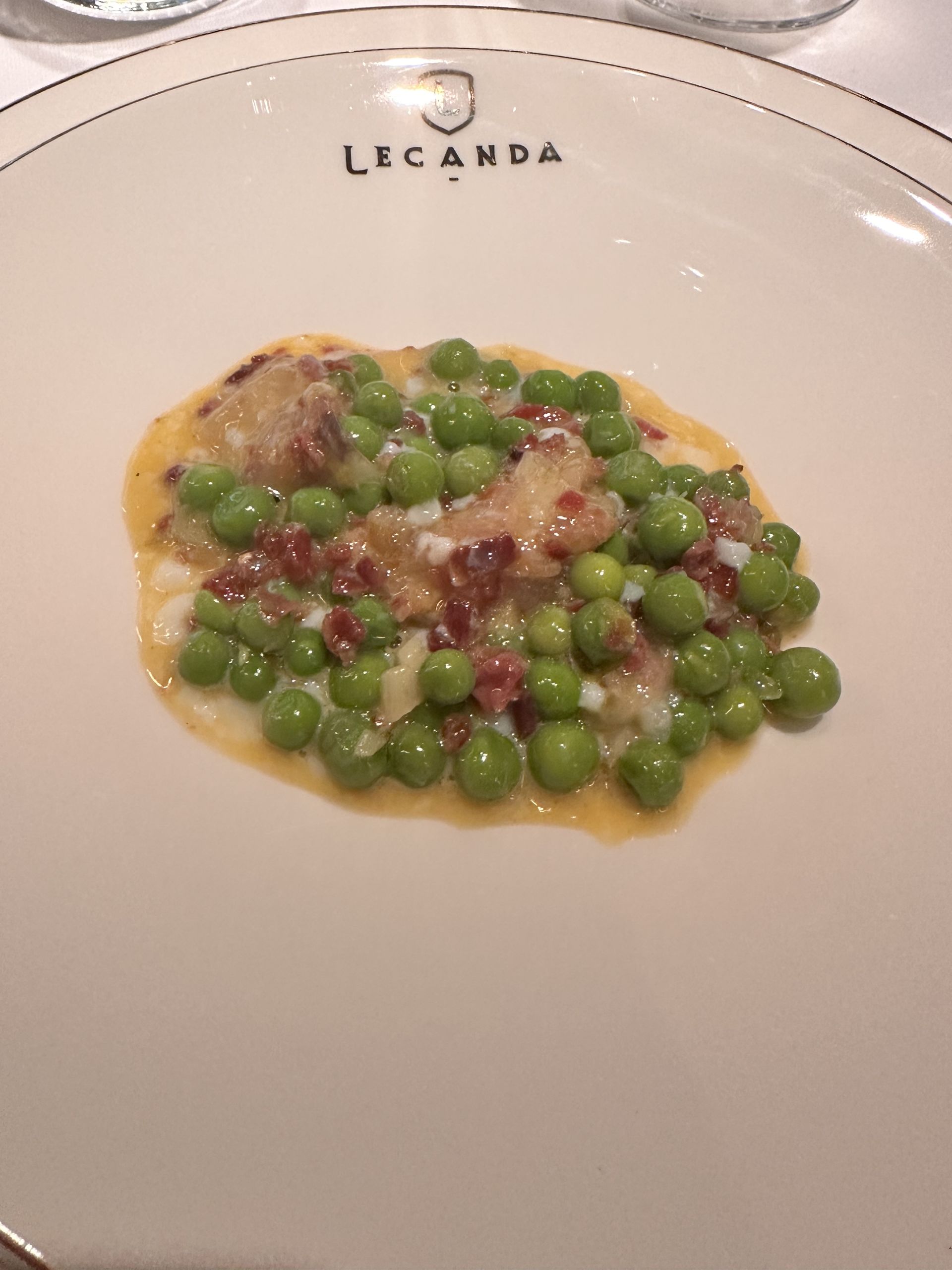Legumbres de temporada a la brasa, en este caso guisantes –no lágrima– con jamón y velo de jamón Joselito y dos huevos a baja temperadura escondidos tras una muy buena salsa bearnesa.