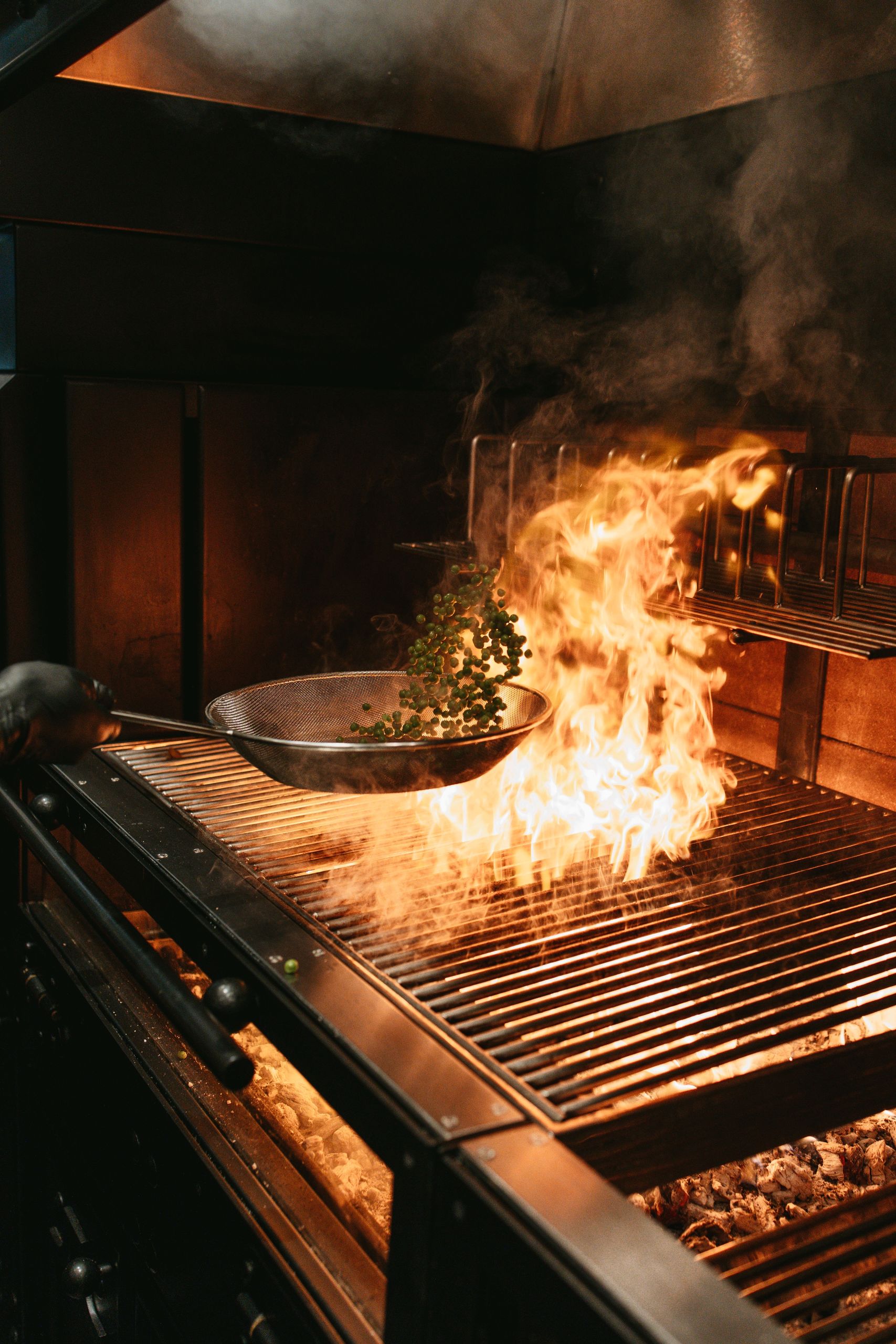Las brasas son protagonistas hasta para las verduras y legumbres, como estos guisantes.