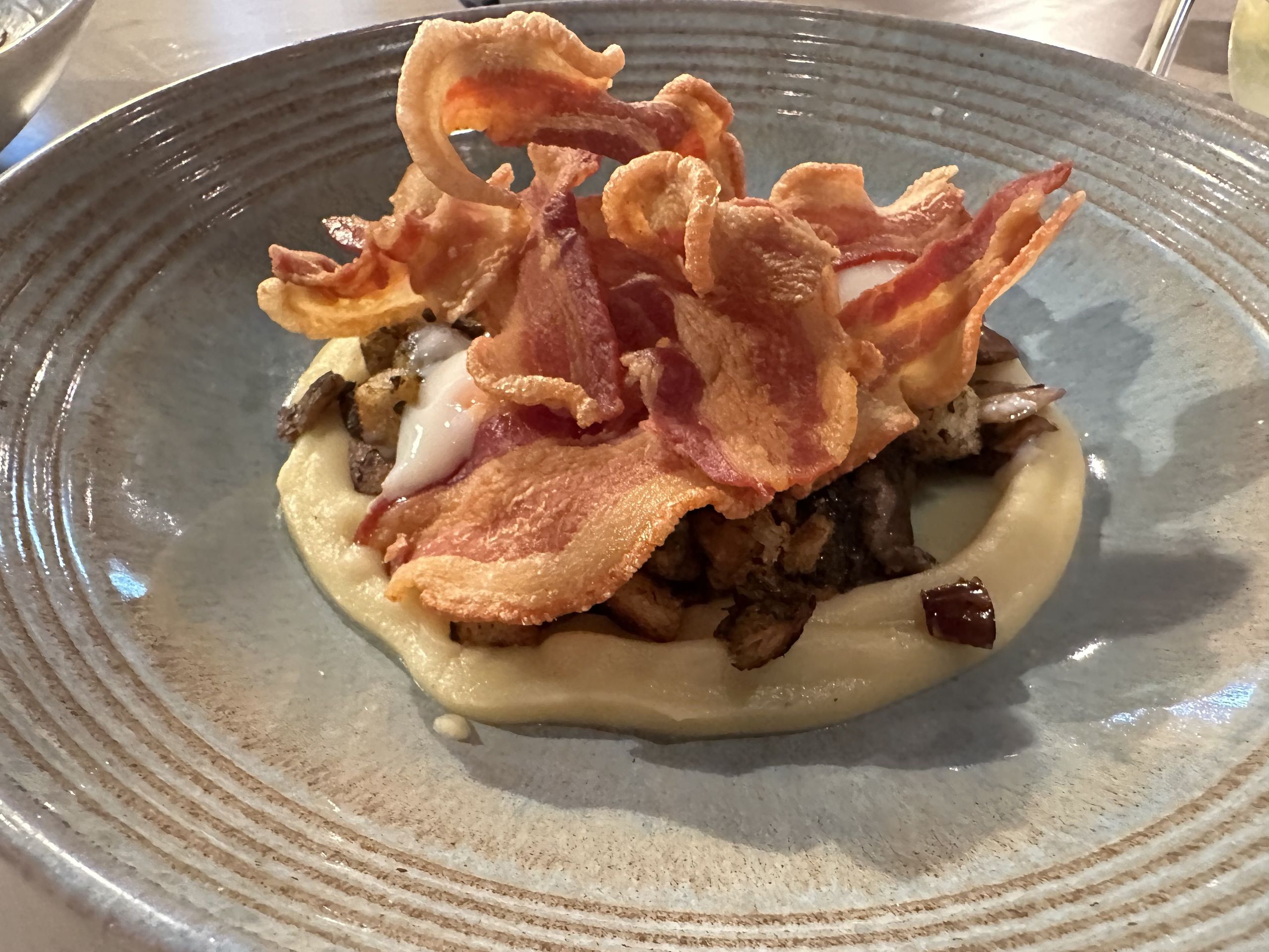 De los antipasti llegan unos sorprendentes briciole trufado con huevos a baja temperatura y torrezno de Soria, una versión de las migas de hogaza trufadas con setas, huevos a baja temperatura, torrezno de Soria y parmentier de patata. Más ligero de lo que parece a primera vista.