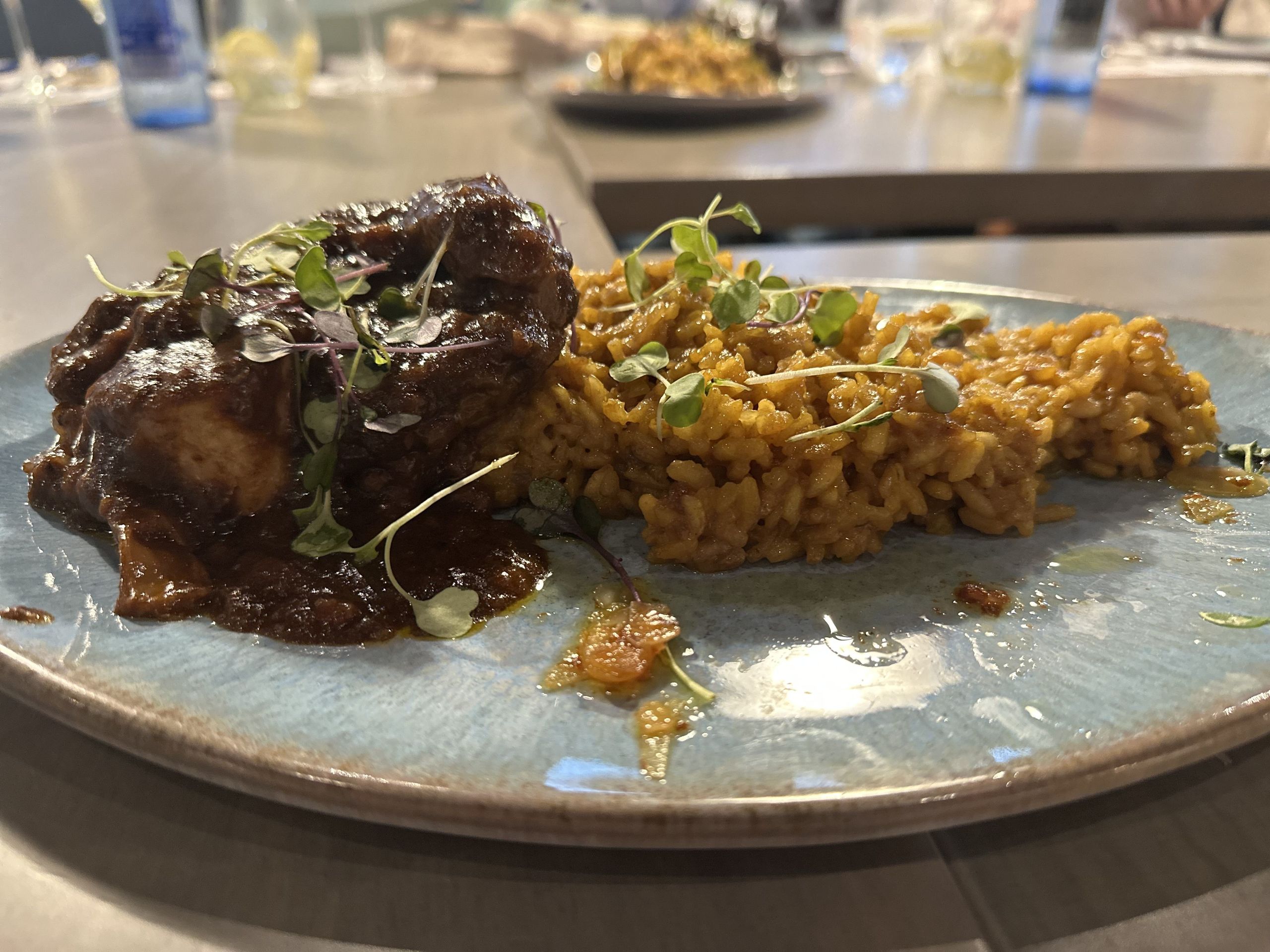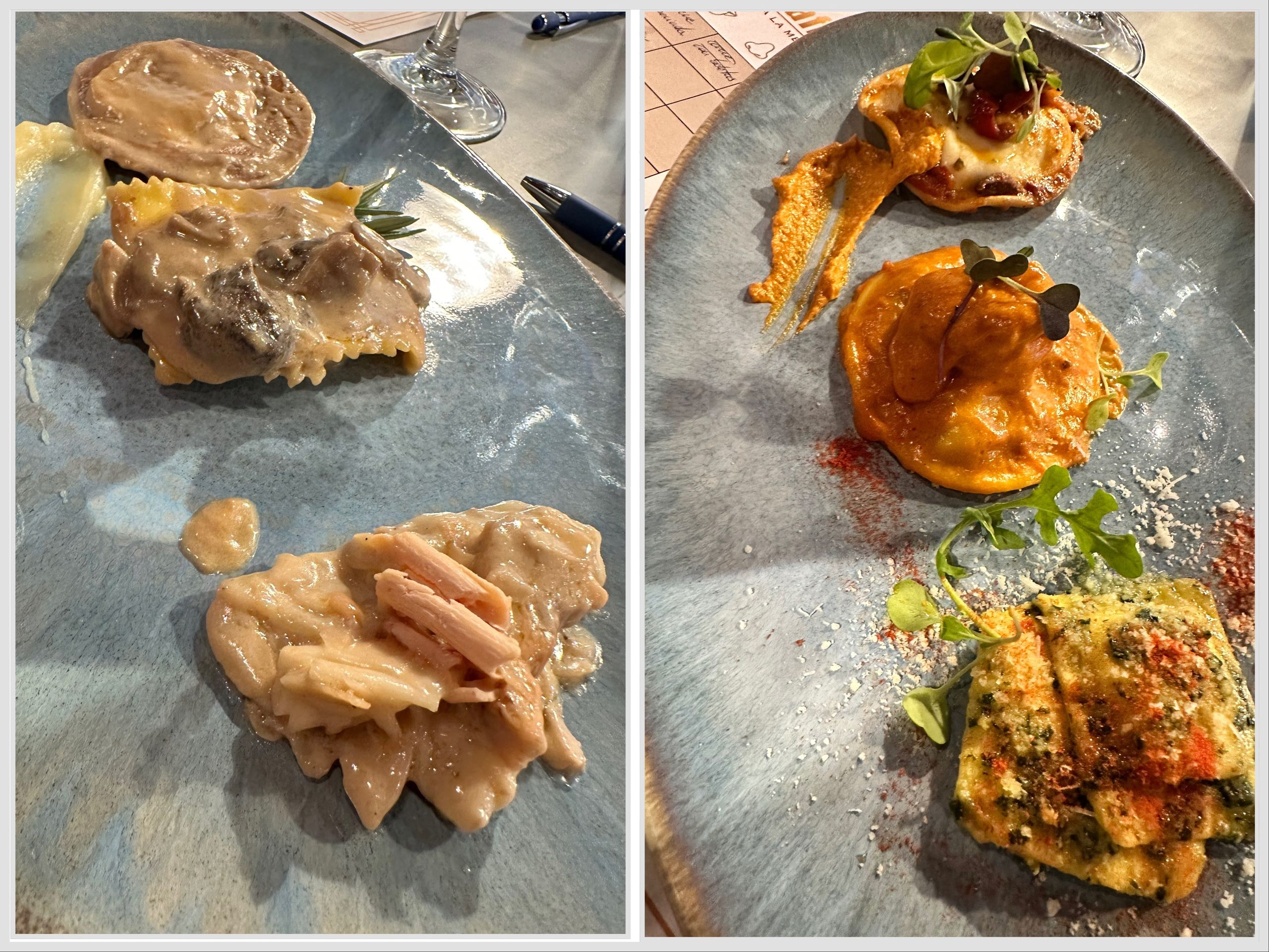 De esas recetas exclusivas probamos los caramelos de morcilla, con piquillo y Pedro Ximénez con salsa mandorle y foie. Mejores los giganti de cordero lechal en salsa de Pedro Ximénez y foie, que es una pasta rellena de cordero lechal al aroma de tomillo limón con salsa de setas, crema de leche, Pedro Ximénez y foie. Y mucho mejores y con ese toque español, los rotondi di cioccolato relleno de rabo de toro, una pasta rellena de rabo de toro y carrillera con salsa toffee de carne sobre parmentier de patata.