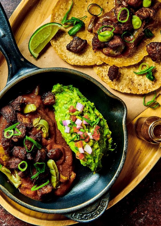 Taco de chicharrón de arranchera, servido en una cazuela con aguacate machacado, salsa de chile morita, nopalitos y tortillas de maíz para armar tacos en la mesa.