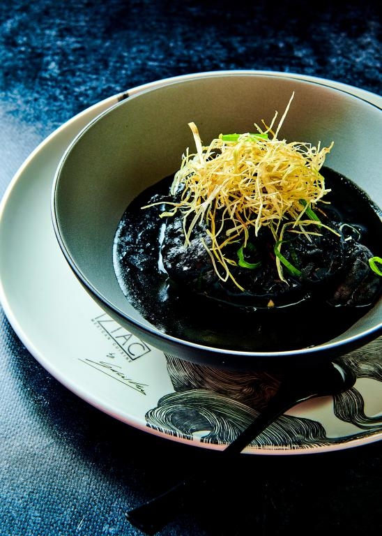 Camarones y chopitos petrolera. Gambas y chopitos flambeados al tequila en salsa de tinta de calamar y queso holandés.