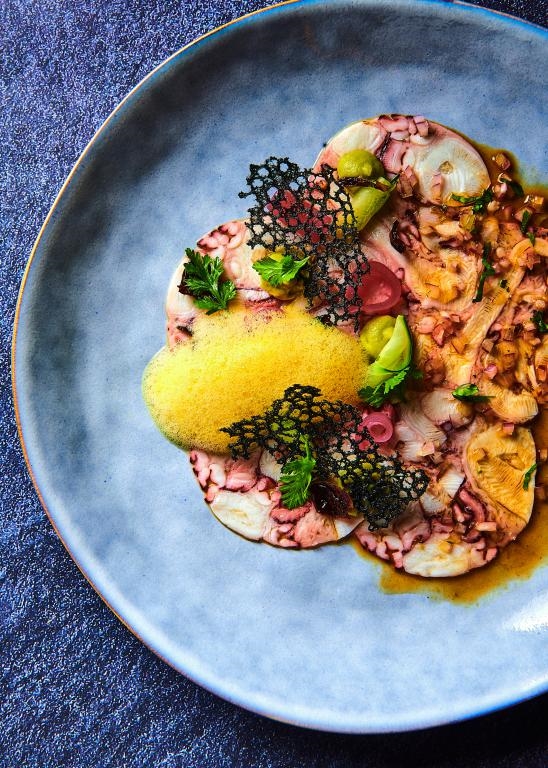 Pulpo rasurado, finas laminas de pata de pulpo, zumo de lima, salsas negras, cebolla roja, chile habanero y cilantro para comer con tostadas y aguacate.