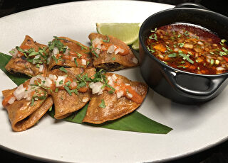Y de los nuevos platos tienes también para elegir entre las chalupas poblanas, el pulpo rasurado, los tacos de jaiba o las tostadas de bacalao. En esta ocasión probamos unos buenos molotes de maíz (14,50€). Cuatro unidades de masa de maíz relleno de papa con chorizo, bañadas con salsa de tomatillo verde, repollo, nata y queso fresco.
