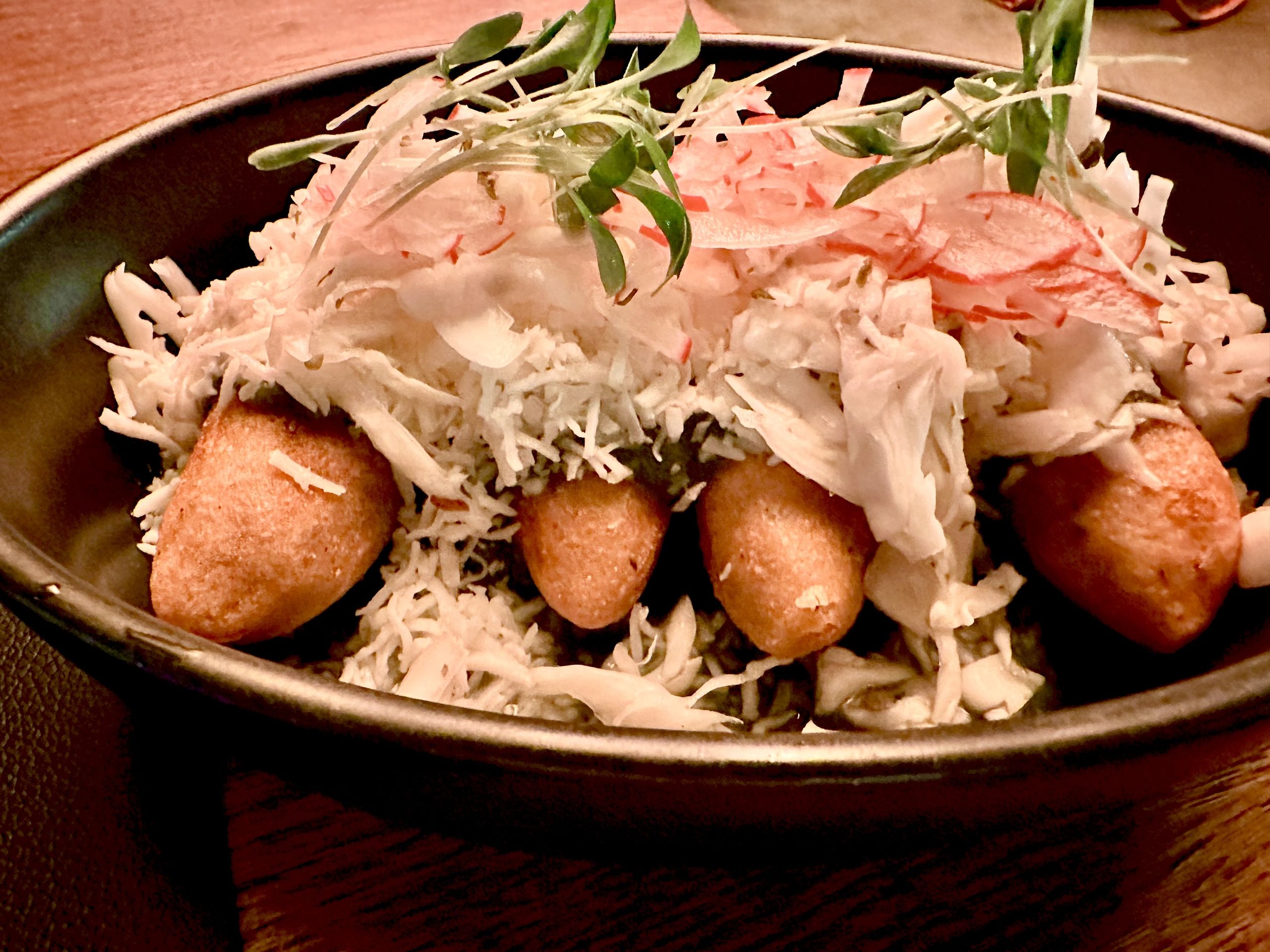 Y de los nuevos platos tienes también para elegir entre las chalupas poblanas, el pulpo rasurado, los tacos de jaiba o las tostadas de bacalao. En esta ocasión probamos unos buenos molotes de maíz (14,50€). Cuatro unidades de masa de maíz relleno de papa con chorizo, bañadas con salsa de tomatillo verde, repollo, nata y queso fresco.