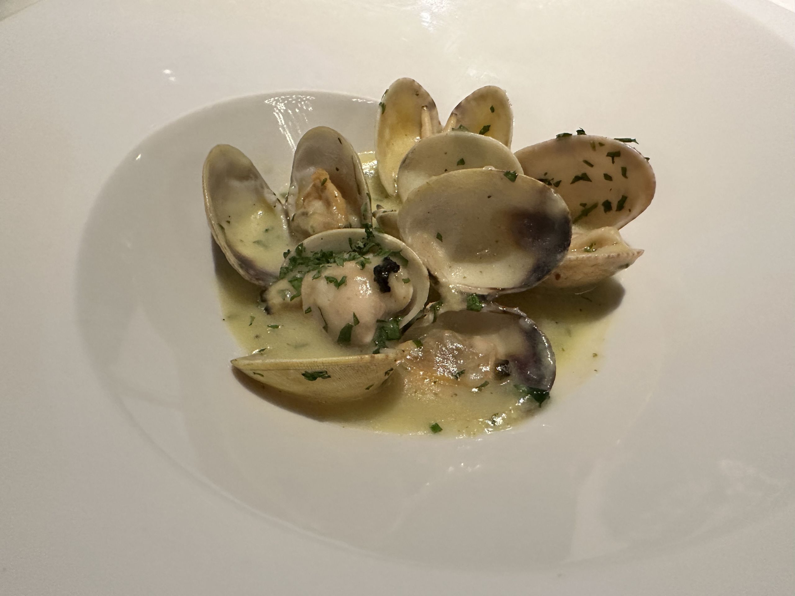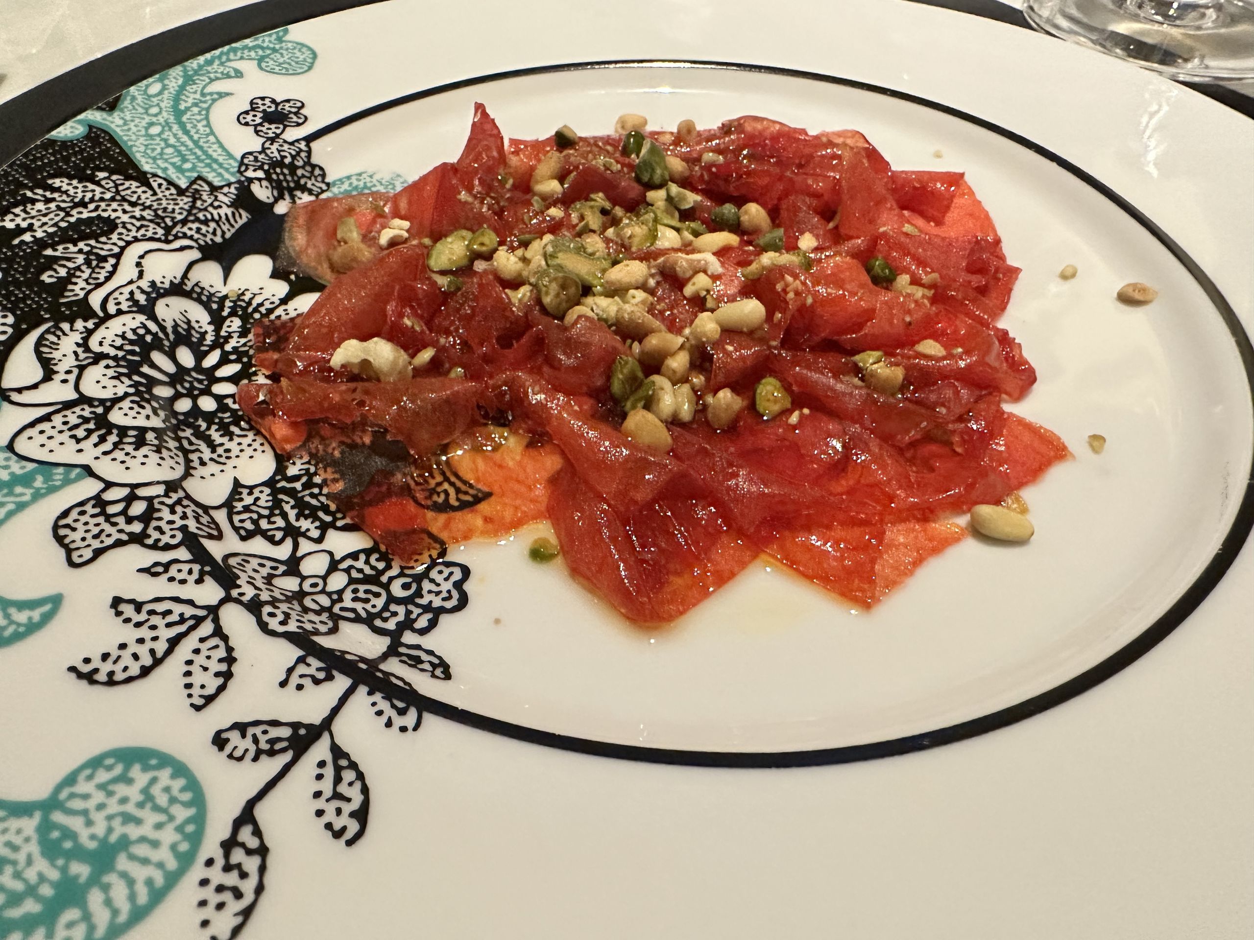 Y de ese cuidado por el producto y con platos con grandes fondos llegan unas exquisitas almejas de Carril con salsa de albariño (36€). También se han preocupado de adaptar la carta a la época estival con nuevas y refrescantes elaboraciones como el carpaccio de gamba con su esencia, jalapeño y jengibre; el salmorejo de mango con anguila ahumada; o el carpaccio de sandía con vinagreta de frutos secos (19€), sin duda un buen plato con unas finas láminas de la fruta que combinan muy bien con el crujiente de los frutos secos.