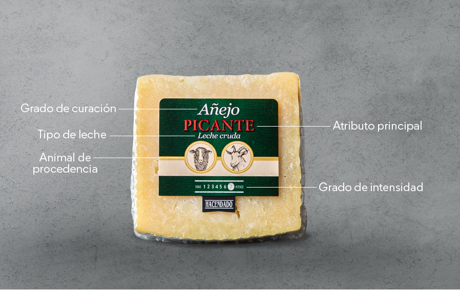 Además, la etiqueta permite identificar claramente los atributos generales, desde el grado de curación (tierno, semicurado, curado, viejo o añejo) hasta su atributo principal (cremoso, intenso, tostado…), pasando por el tipo de leche, animal del que procede, su procedencia o grado de intensidad.