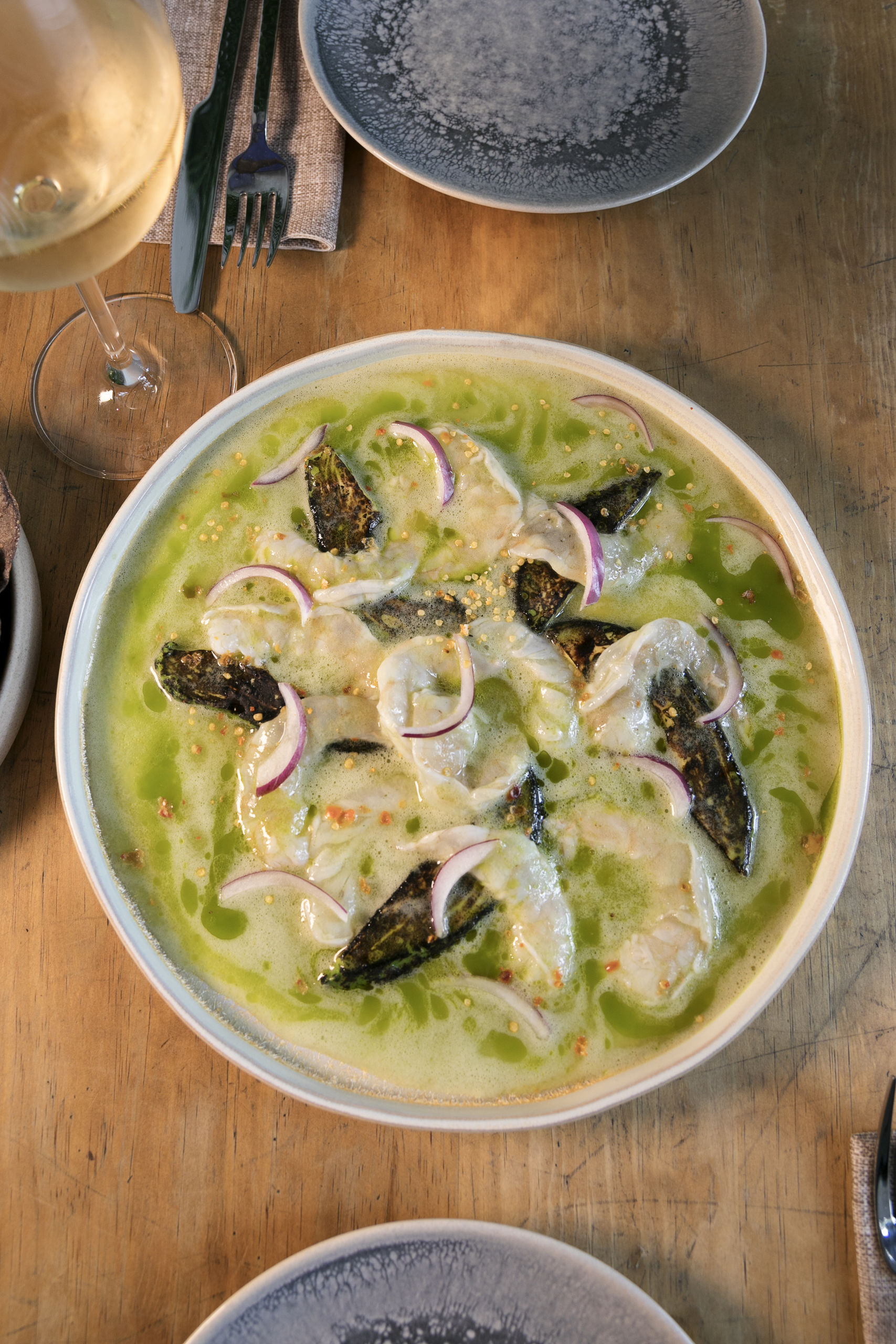 Aguachile verde de langostinos, preparado con langostinos marinados con agua de pepino, cítricos y chile jalapeño sobre base de aguacate tatemado, cebolla morada y aceite de cilantro, acompañado con tostadas de maíz azul.