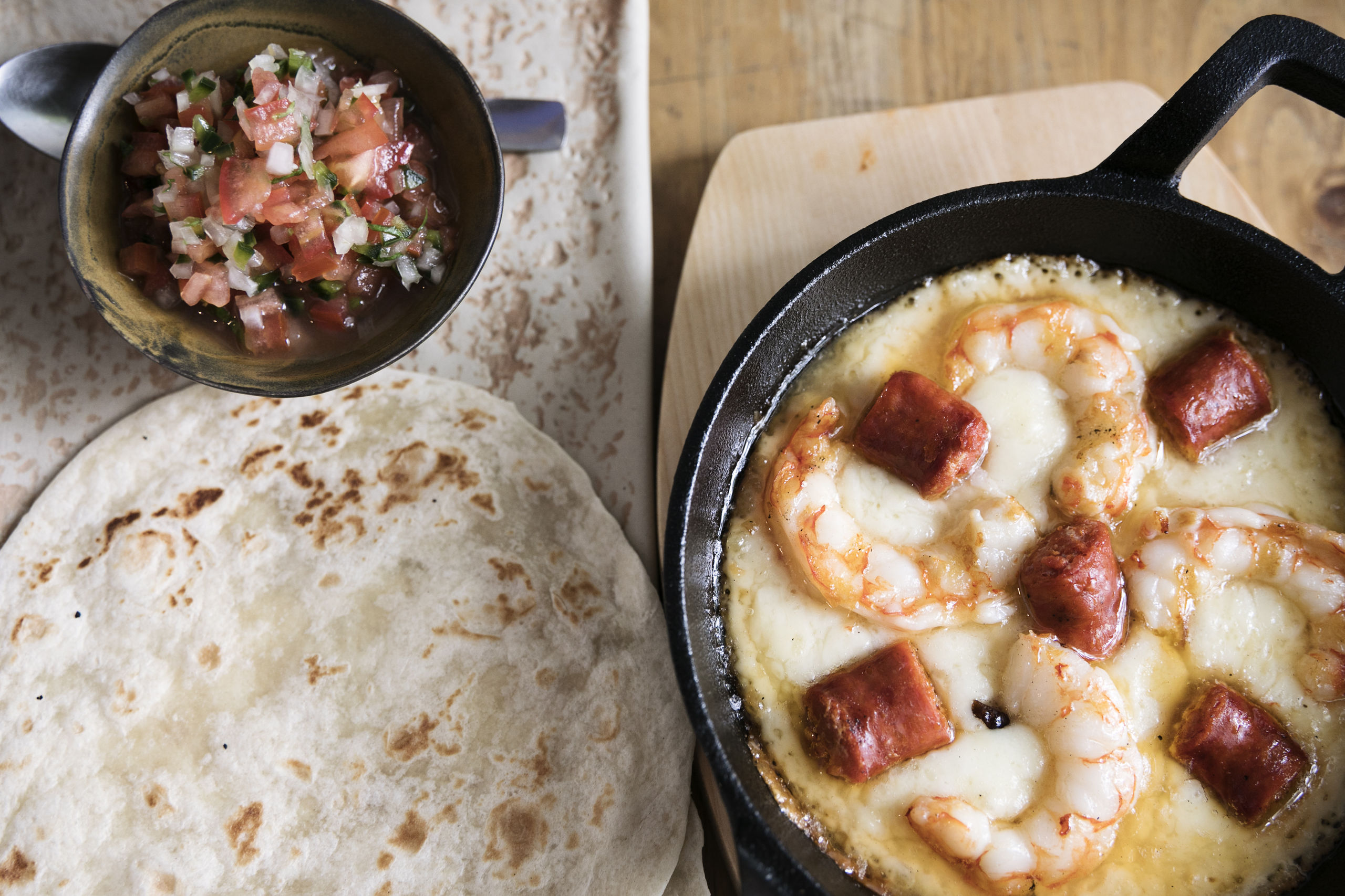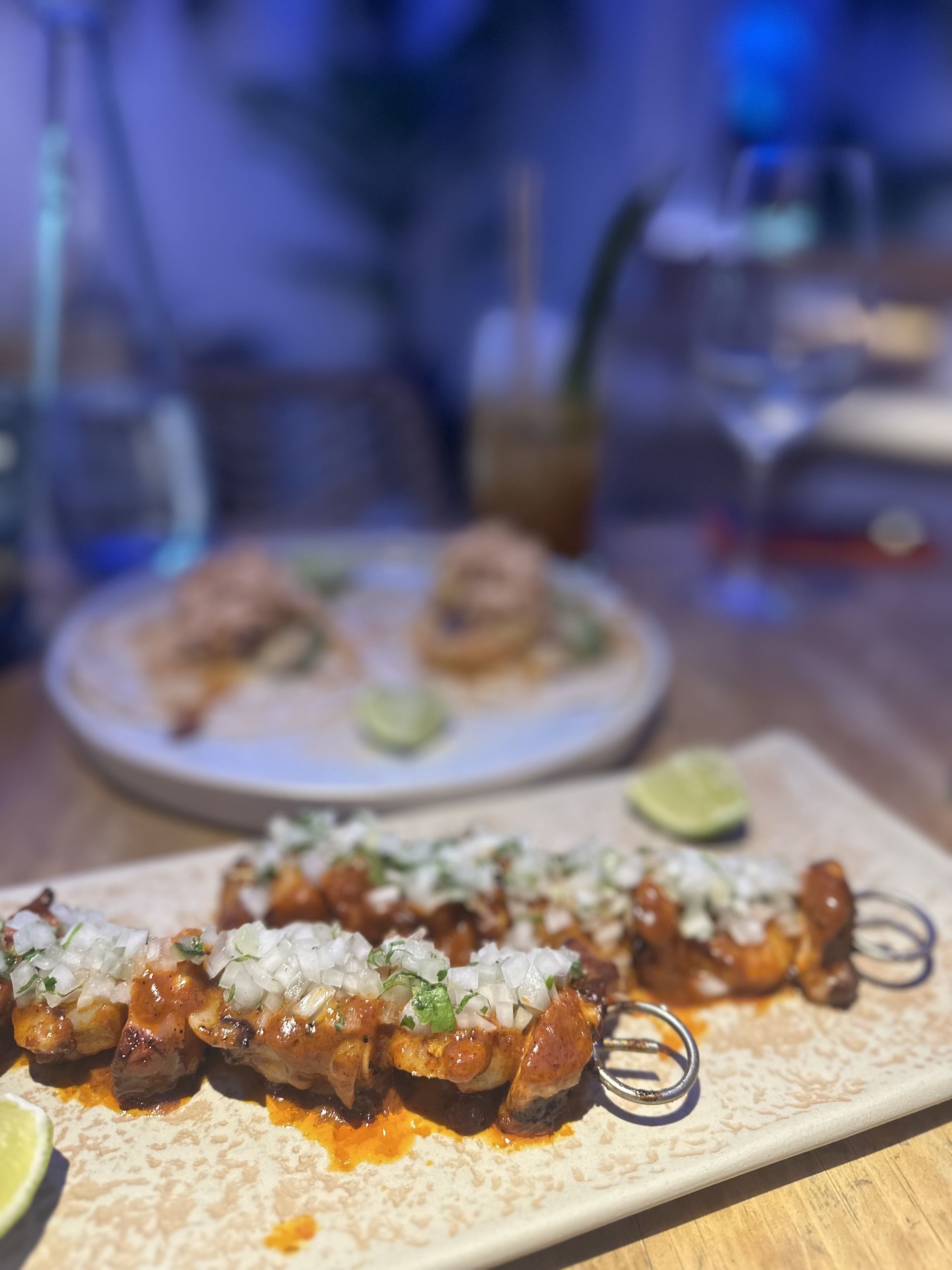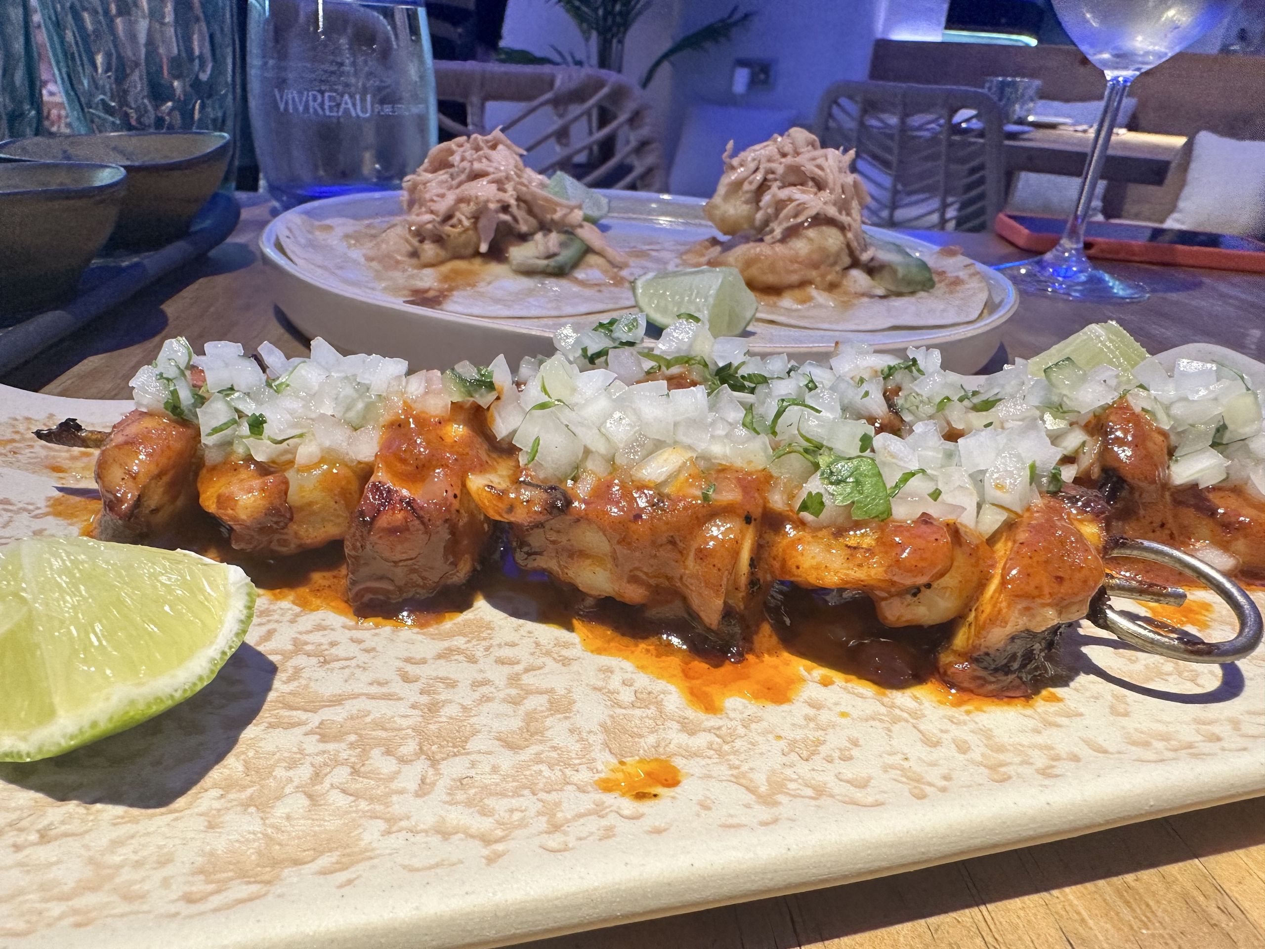 Brochetas de mariscos braseados y glaseados de tamraindo chile, guajillo y ajo. Y tacos Gobernador de gambión rebozado, con queso, frijol negro, gambón rebozado, aguacate y ensalada de col con alioli de chile chipotle.