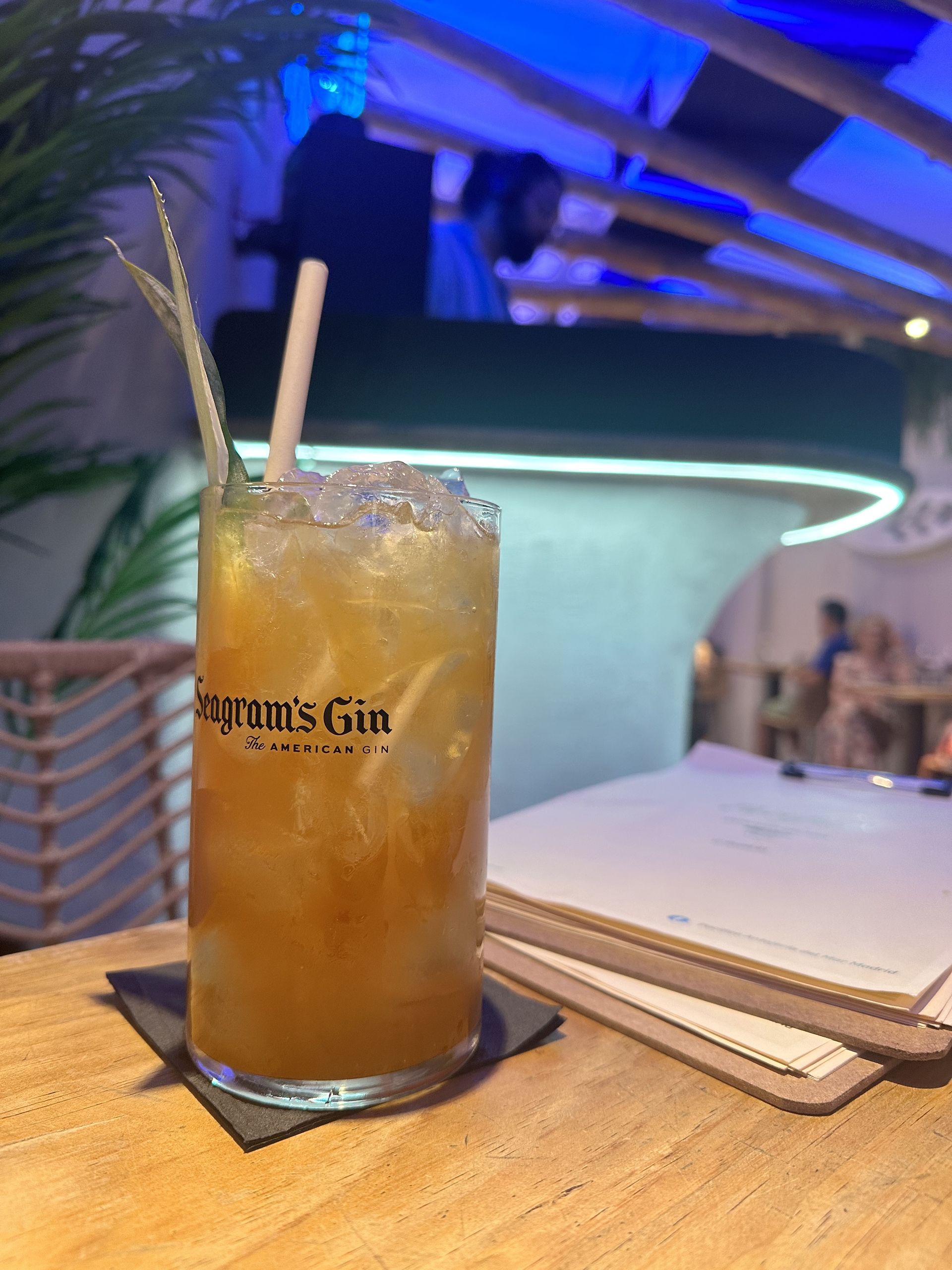 Cóctel Malinche, de Patrón añejo, Kraken, maracuyá, zumo de lima y ginger beer y el DJ de fondo.