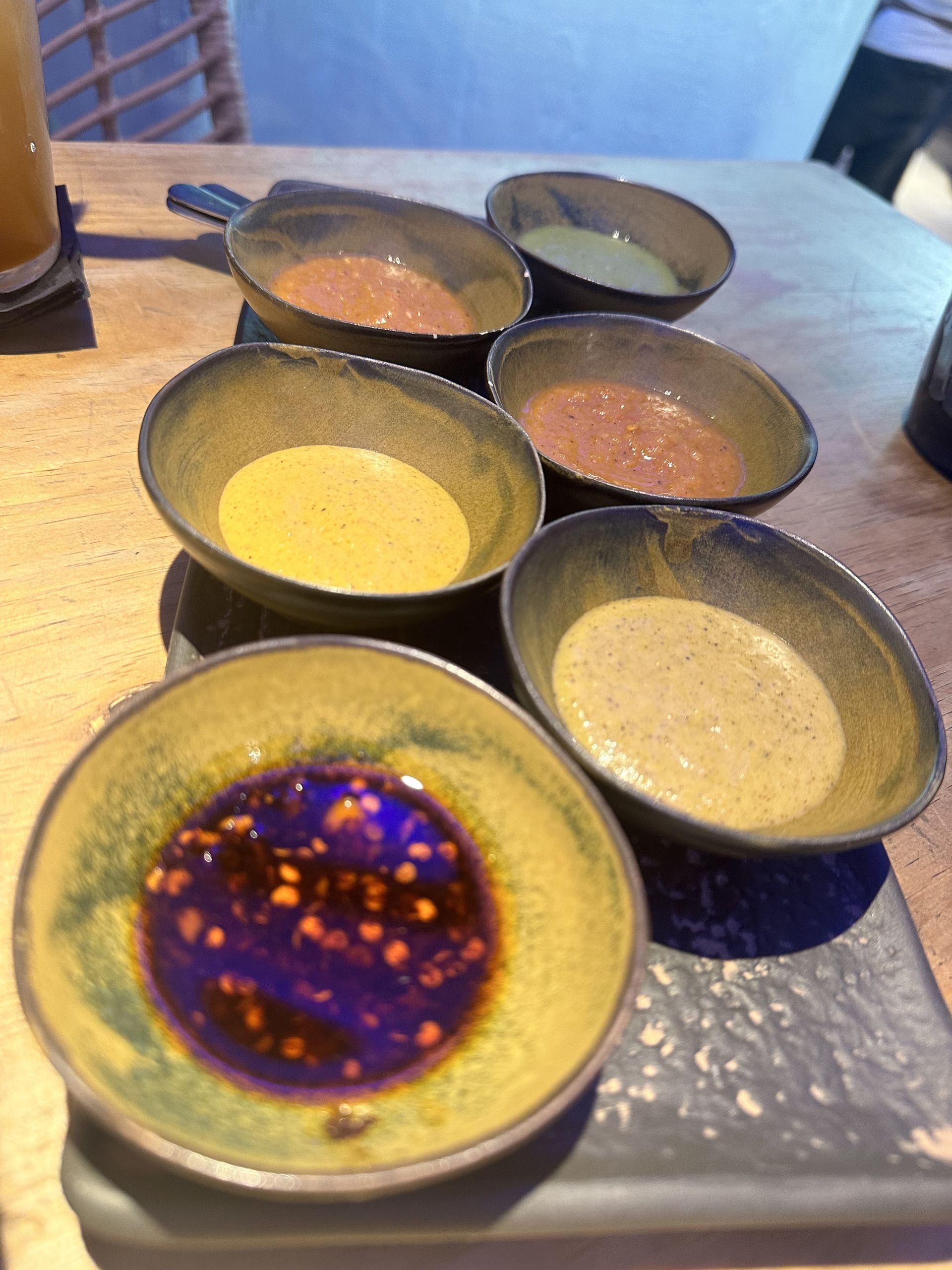 Seis salsas de menor a mayor grado de picante: salsa verde, salsa de tomatillos, salsa borracha, salsa de habanero con piña asada, salsa de jalapeños con cilantro y la salsa macha.