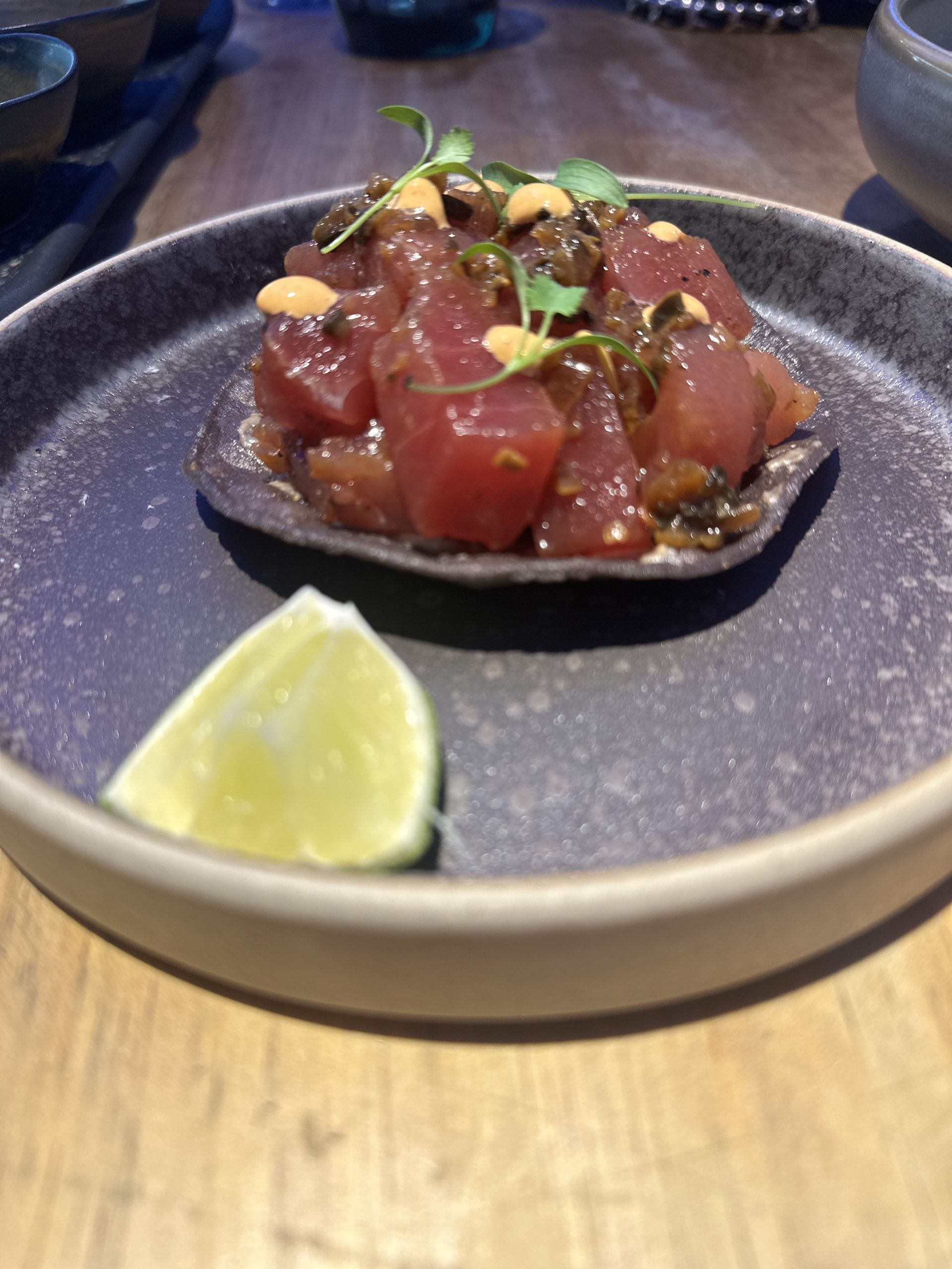 Tostada de atún rojo y tuétano a la brasa. Es una tortilla de maíz azul crujiente con crema de tuétano a la brasa, aguacate, atún rojo y chiles toreados.
