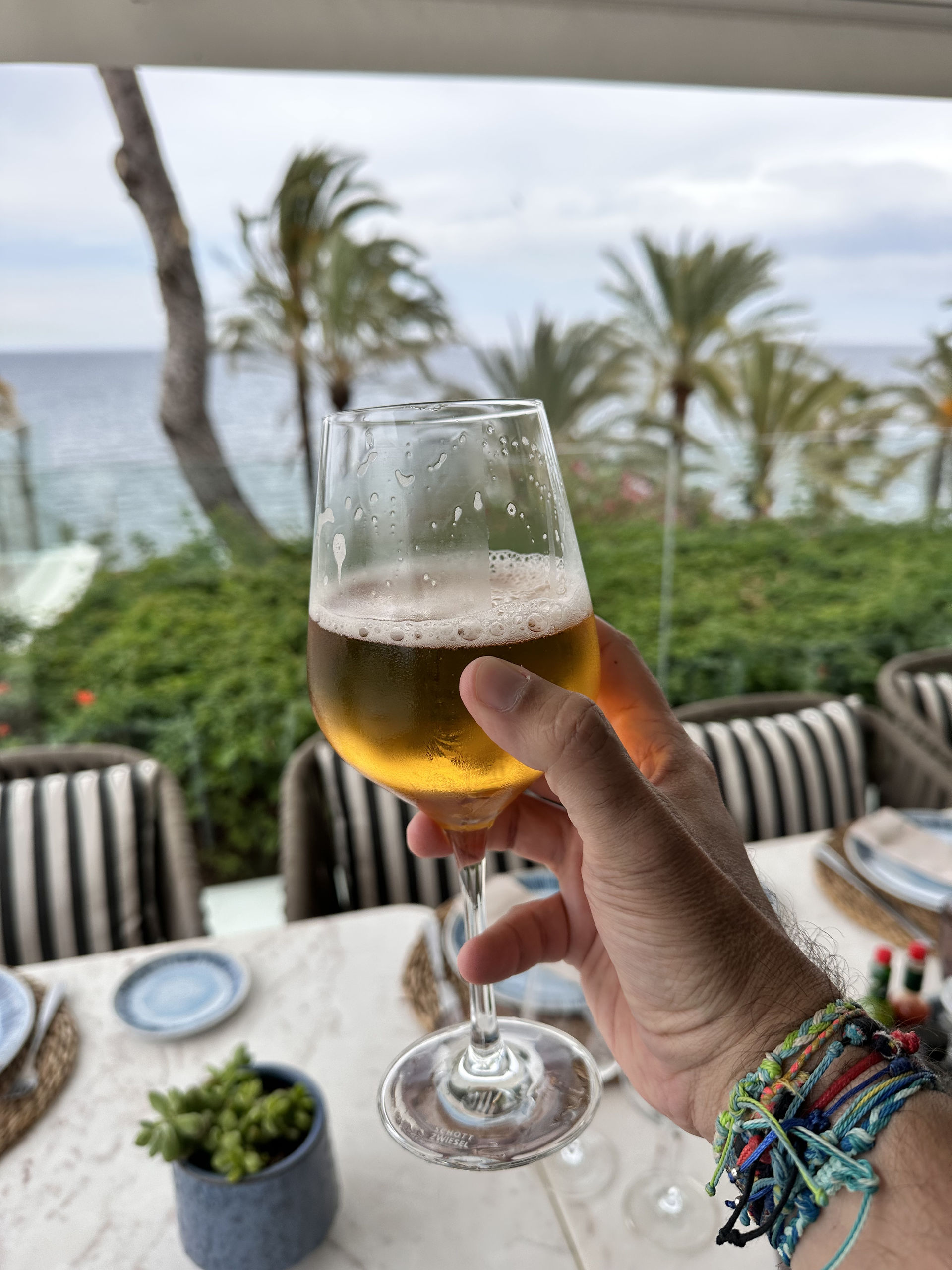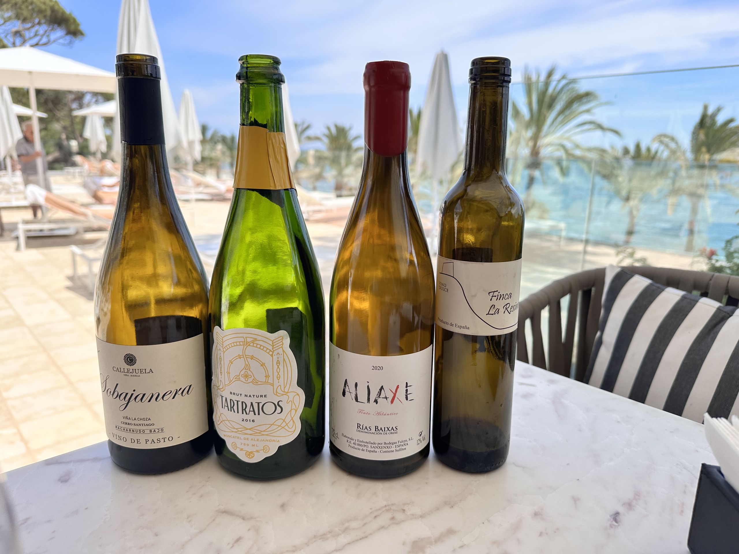 Bardot cuenta con una amplia variedad de cócteles para acompañar la comida o los entrantes y una carta de vinos con más de 300 referencias y perfectamente asesorada por el sumiller del hotel, Dani Calvente. Nos ofreció para maridar todo el menú un sutil Jerez Sobajanera; otro brut nature Tartratos, de la misma bodega que el anterior Antonio Muñiz Cabrera; un vino tinto Atlántico Aliaxe de las Rías Baixas, de Bodegas Fulcro; y por último para acompañar los postres un vino dulce de Málaga Finca La Resinera.