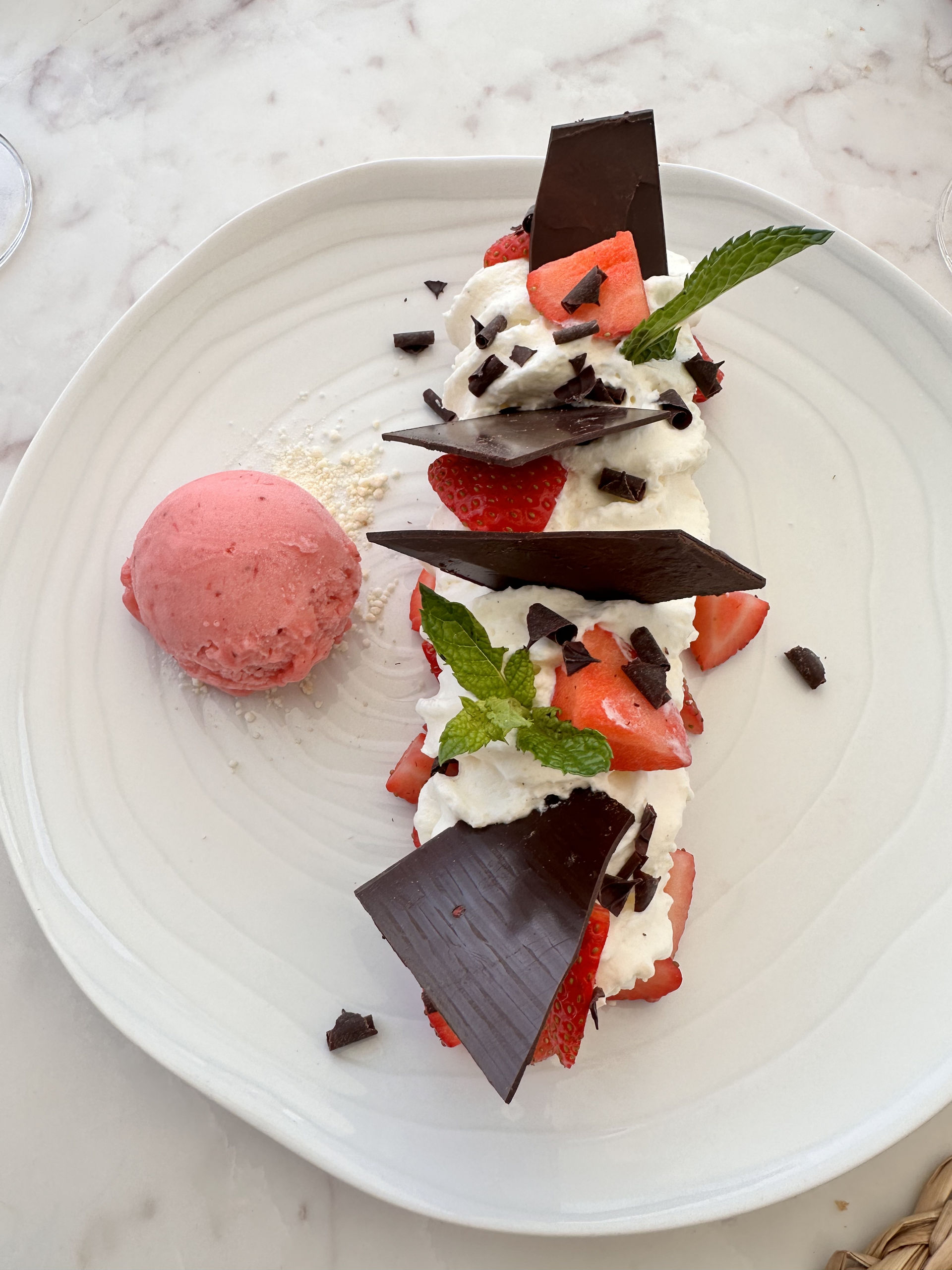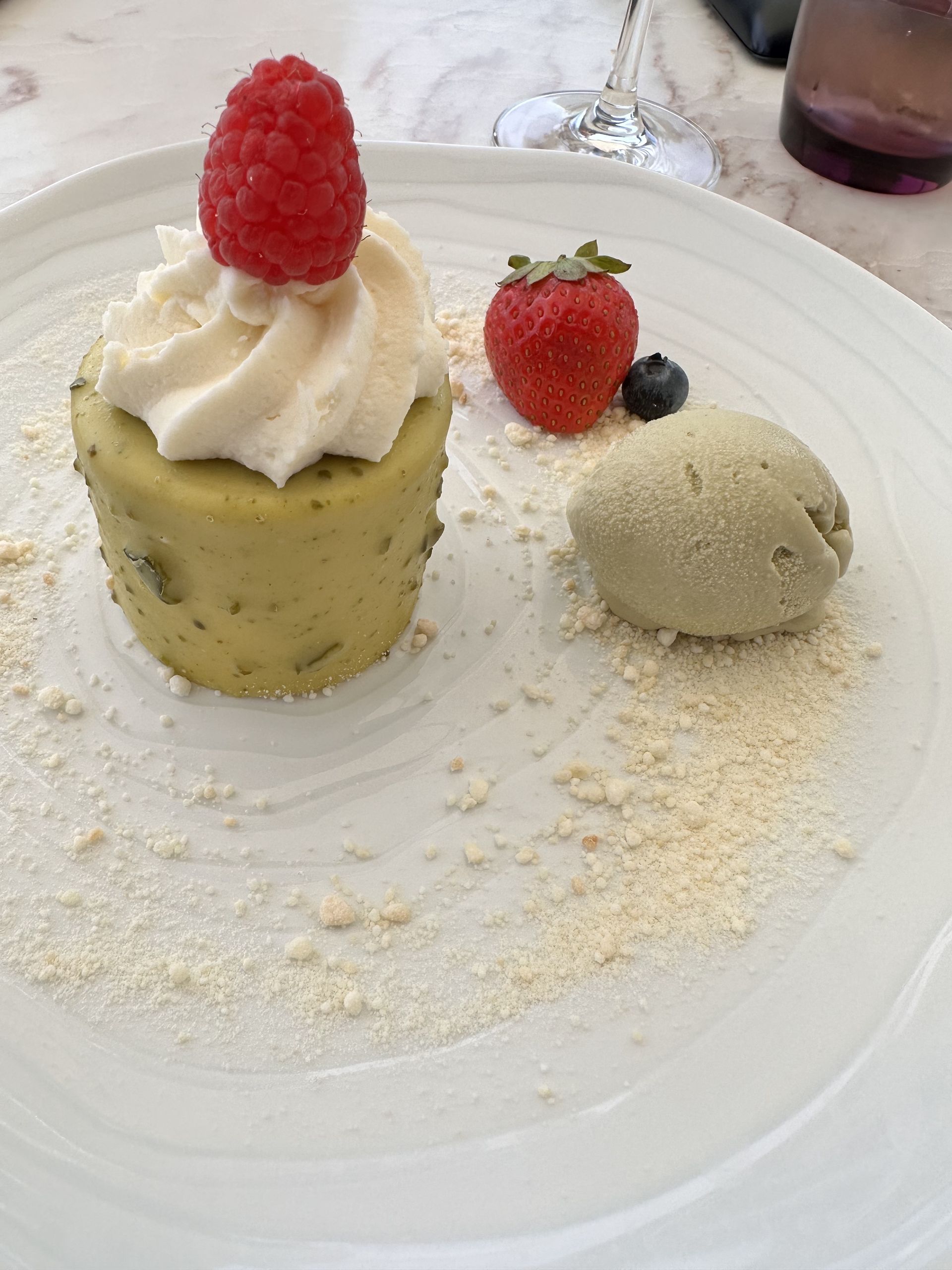 De los postres de Bardot se encarga el jefe de pastelería del hotel, Andrés Moreno, que son caseros de principio a final y que nos preparó tres postres que reflejan muy bien ese trabajo hecho en casa como el semifrio de pistacho y chocolate blanco.