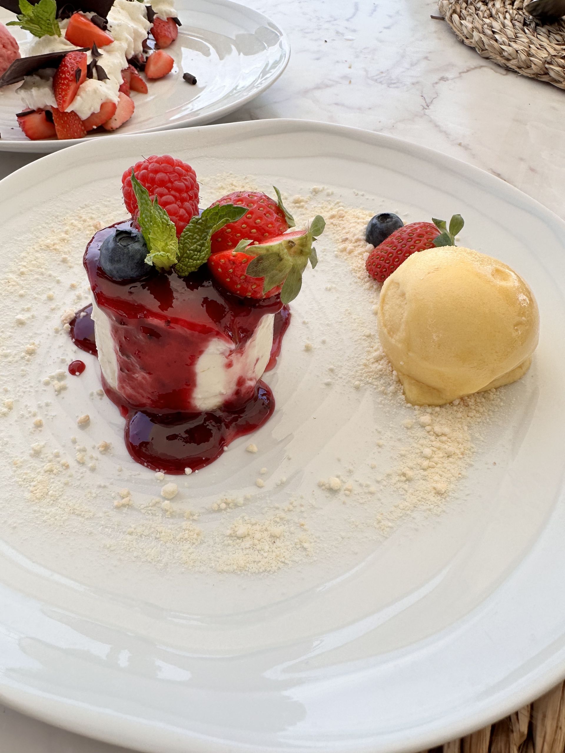 Tarta de queso cuajada, en la que en lugar de hacer la típica tarta horneada la hace así para que quede más fina, por lo que es una cuajada de queso con limón y helado de maracuyá.