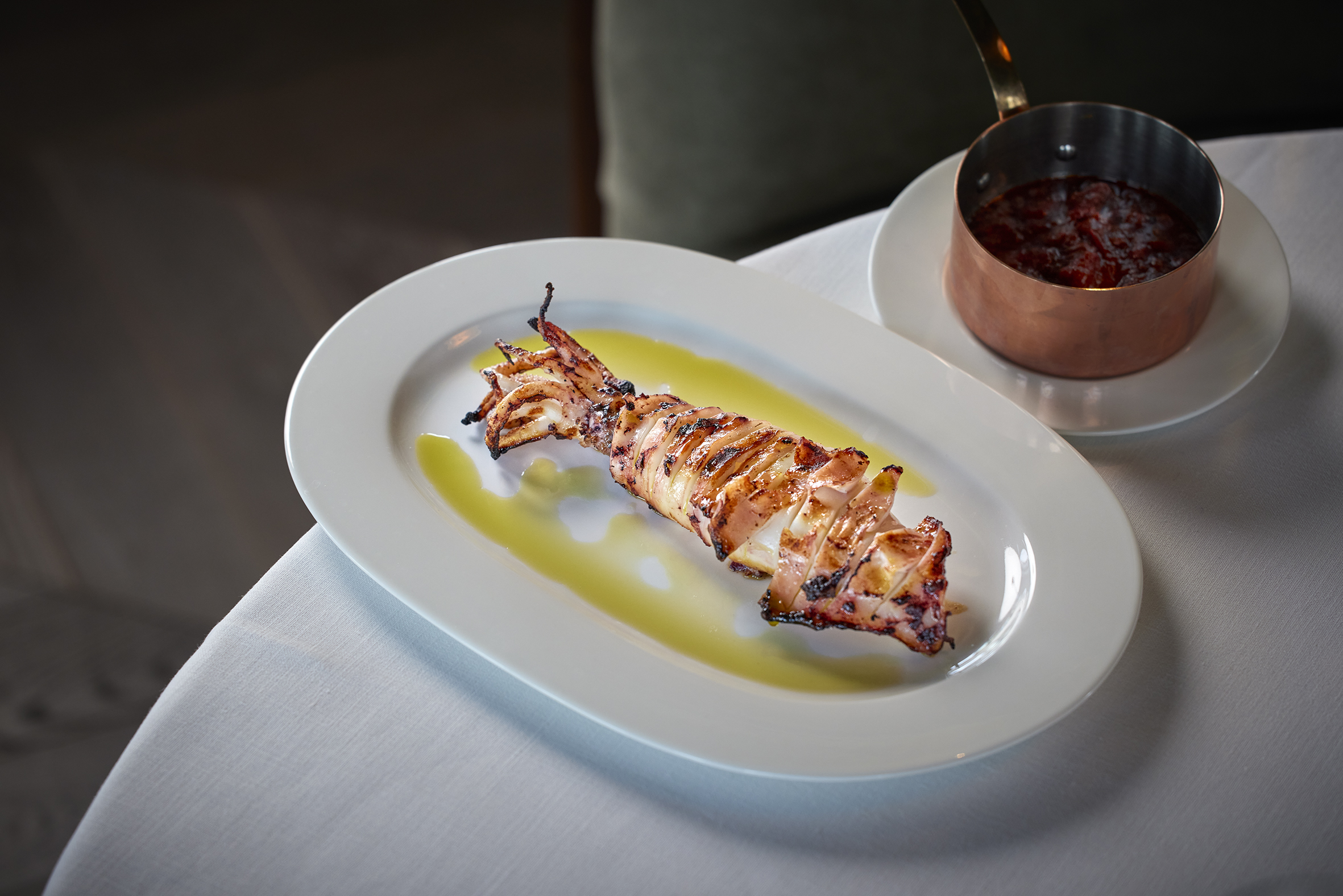 Nino Redruello también ha recurrido a recetas rescatadas de antaño y actualizadas como la ensalada de San Isidro o como el espectacular calamar de anzuelo "a lo Sochantre", una preparación típica gallega a base de tomate que fue bautizada así por Don Manuel María Puga y Parga, cronista gastronómico de principios del siglo XX, en honor a un amigo sochantre –director del coro en los oficios divinos– de la Real e Insigne Colegiata de La Coruña.
