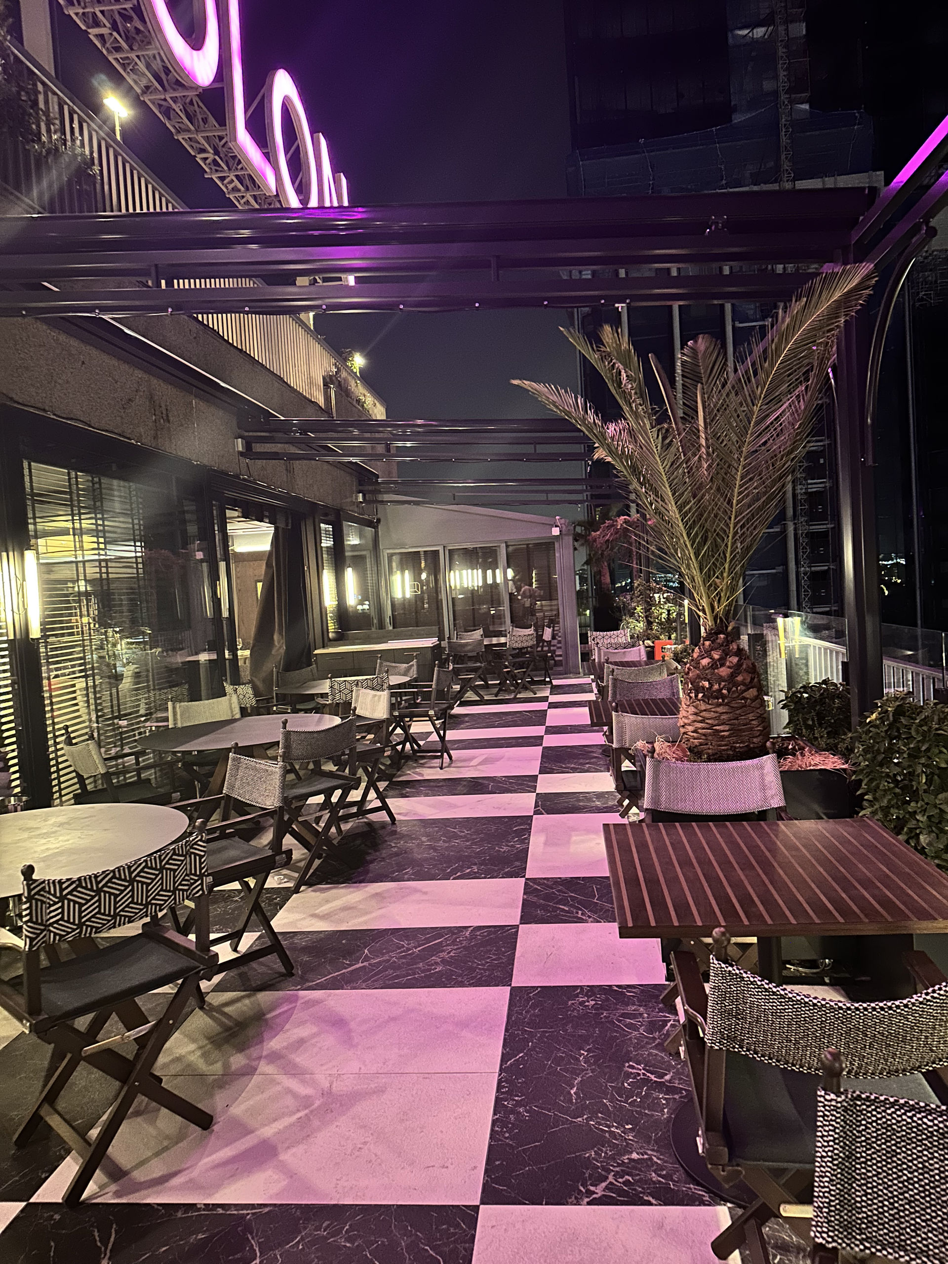 La terraza de la planta 14 del Club Financiero Génova está iluminada por la noche con el neón del Centro Colón.