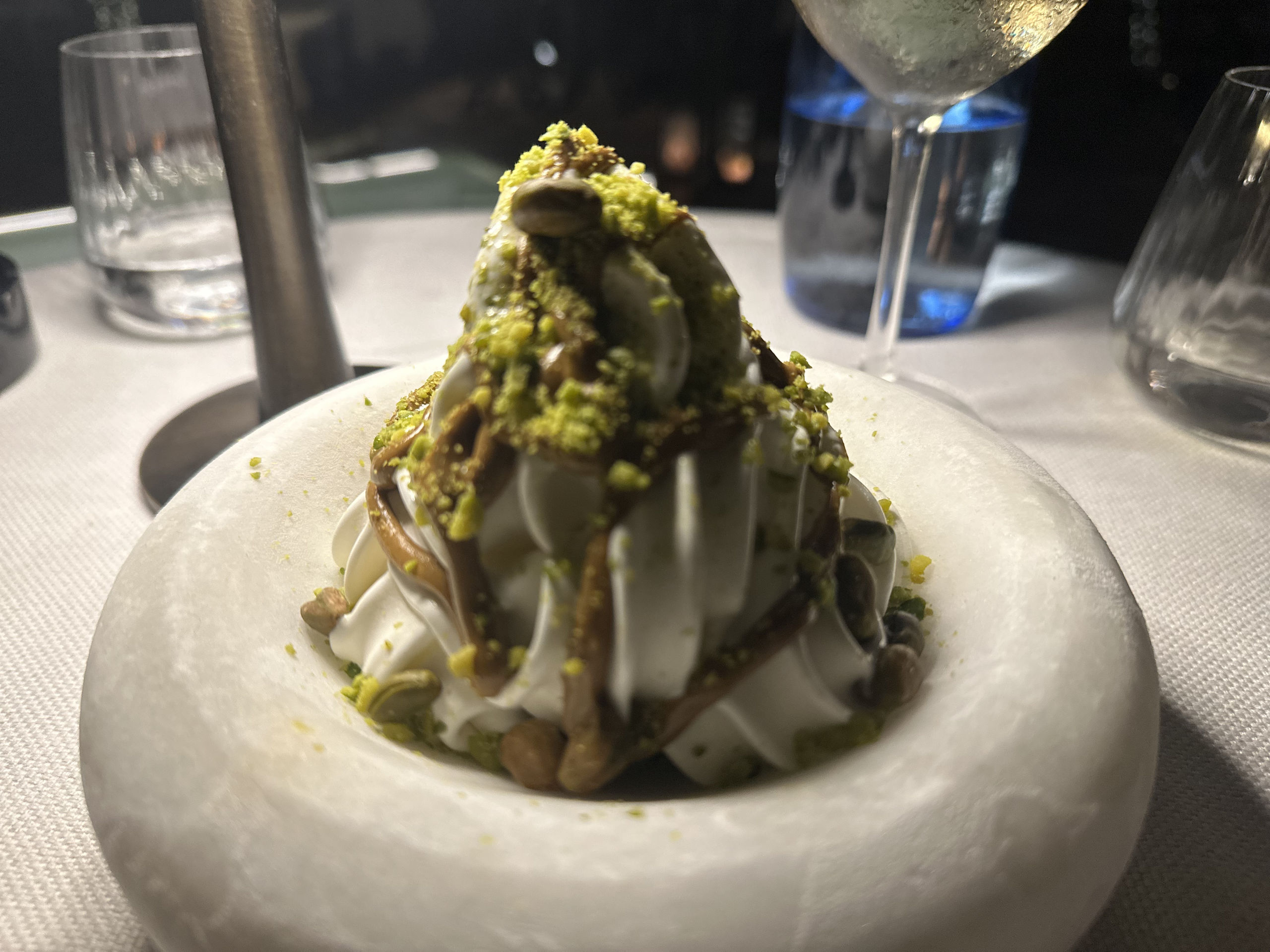 También muy buenos y con un guiño especial al Mediterráneo los mezzi paccheri alla pescatora con calamaretti e pistacchio (24€), un tipo de macarrón grande con una impresionante salsa de mariscos, con unas frescas y sabrosas puntillitas salteadas y el toque ‘crunchy’ de los pistachos.