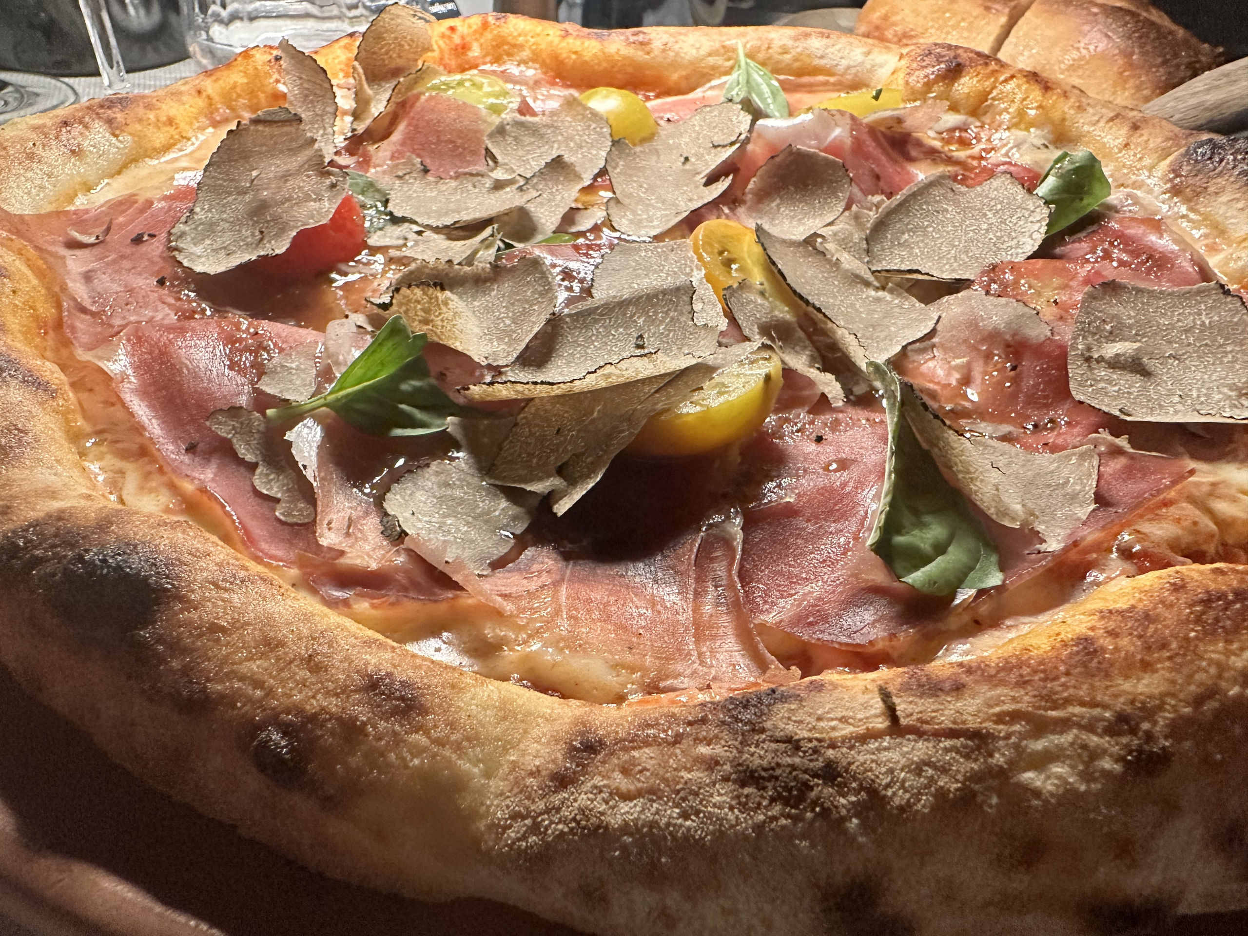 Comenzamos, como es lógico, con los antipasti, en nuestro caso con un muy buen vitello tonnato (18€), de ternera blanca cortado a cuchillo y con su deliciosa y suave salsa de alcaparras y anchoas. Me sorprendió muchísimo la calidad y el maravilloso sabor de la pizza di massi (19€), que en lugar de queso mozzarella llevaba mascarpone –con el que se hace el tiramisú–, tomate, jamón San Daniele y trufa. La masa estaba perfectamente cocinada y los ingredientes no podían ser más acertados.